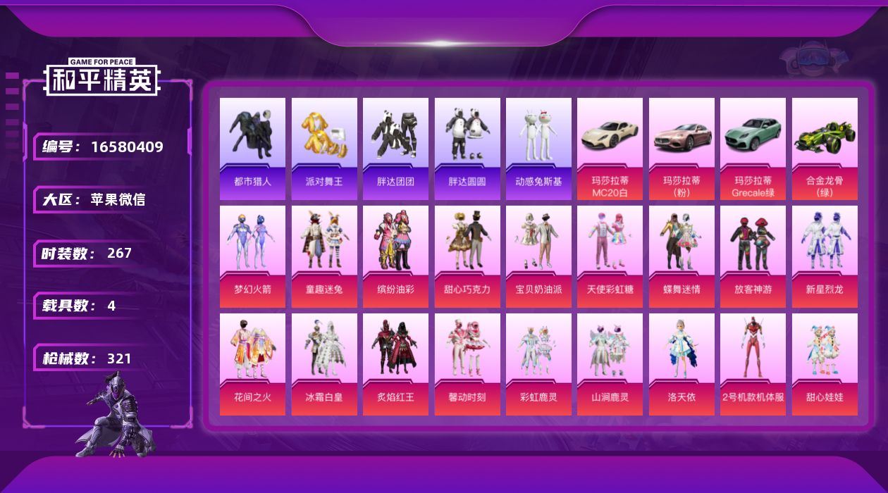 [16580409]裙子号【特价出售/店主推荐】苹果 微信-35粉装-16特效枪-4载具-5粉色飞行器-12w热力值-20王牌印记-267套装-321枪皮 【热门品类】:粉装-梦幻火箭,粉装-童趣迷兔,粉装-缤纷油彩,套装-浪漫天命,套装-都市猎人,套装-派对舞王,套装-小丑鱼,套装-胖达团团,套装-胖达圆圆,套装-动感兔斯基人偶服,套装-SS1特训,套装-龟仙人,套装-浪漫波比,套装-粉红小猪,熔岩游骑兵连帽夹克 【粉色套装】:粉装-甜心巧克力,粉装-宝贝奶油派,粉装-天使彩虹糖,粉装-蝶舞迷情,粉装-梦幻火箭,粉装-缤纷油彩,粉装-放客神游,粉装-新星烈龙,粉装-花间之火,粉装-冰霜白皇,粉装-童趣迷兔,粉装-炙焰红王,粉装-馨动时刻,粉装-彩虹鹿灵,粉装-山涧鹿灵,角色-洛天依,角色-2号机款机体服,粉装-甜心娃娃,粉装-甜梦小狐,粉装-妙趣可丽,粉装-暖熊萌萌,粉装-旋转彩虹,粉装-冰川粉黛,粉装-冰川幽秘,粉装-冰川红玫,粉装-寒光使者,角色-歌者泠鸢,粉装-第五大道,粉装-挚爱序曲,角色-白勺歌姬,角色-呆萌星弥,角色-白兰星,粉装-莲影清波,粉装-金丰海韵,角色-千金淑猫 【粉色枪皮等级】:AKM-甜心宝贝(七级),AKM-星际浪客(一级),SCAR-L-甜梦小狐(五级),M416-心之恋语(一级),M416-至情至圣(九级),GROZA-焦糖拿铁(四级),AUG-妙趣可丽(四级),M762-甜心娃娃(四级),UZI-绮梦青鸾(四级),UMP45-相思残雪(七级),Vector-红伞翩翩(七级),P90-甜蜜草莓(四级),Kar98K-巳巳如意(二级),M249-彩虹甜喵(四级),DP-28-豹影疾电(四级),MG3-洛神天依(四级) 【粉色载具】:玛莎拉蒂MC20(星石白),玛莎拉蒂Ghibli(粉),玛莎拉蒂Grecale(薄荷绿),合金龙骨(绿) 【粉色枪皮】:AKM-甜心宝贝,AKM-星际浪客,SCAR-L-甜梦小狐,M416-心之恋语,M416-至情至圣,GROZA-焦糖拿铁,AUG-妙趣可丽,M762-甜心娃娃,UZI-绮梦青鸾,UMP45-相思残雪,Vector-红伞翩翩,P90-甜蜜草莓,Kar98K-巳巳如意,M249-彩虹甜喵,DP-28-豹影疾电,MG3-洛神天依 【粉色飞行器】:星际浪客飞行器,歌者泠鸢飞行器,纯梦嫁纱飞行翼,黄族统领飞行器 【粉