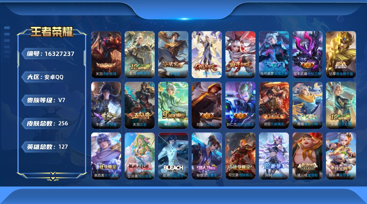 [16327237]安卓Q-V7-至尊星耀V段位-127英雄-256皮肤-1典藏皮肤-12传说-71史诗