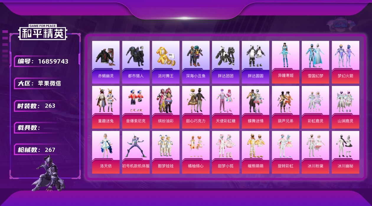 [16859743]【店主推荐捡漏号!可直接换绑】苹果 微信-29粉装-8特效枪-0载具-7粉色飞行器-104803热力值-8王牌印记-263套装-267枪皮【热门品类】:粉装-雪国幻梦,粉装-梦幻火箭,粉装-童趣迷兔,粉装-音爆索尼克,粉装-缤纷油彩,套装-浪漫天命,套装-赤蝎幽灵,套装-都市猎人,套装-派对舞王,套装-深海小丑鱼,套装-小丑鱼,套装-胖达团团,套装-胖达圆圆,套装-暗夜行者,套装-AG战队服,角色-忠真马岱,套装-龟仙人,套装-潮萌小黄鸭,套装-暗影哥特,套装-浪漫波比,套装-粉红小猪,套装-红红火火,大砍刀-青龙偃月刀【粉色套装】:粉装-甜心巧克力,粉装-天使彩虹糖,粉装-雪国幻梦,粉装-蝶舞迷情,粉装-梦幻火箭,粉装-缤纷油彩,粉装-童趣迷兔,粉装-葫芦兄弟,粉装-彩虹鹿灵,粉装-山涧鹿灵,角色-洛天依,角色-初号机款机体服,粉装-酣梦娃娃,粉装-橘柚倾心,粉装-甜梦小狐,粉装-暖熊萌萌,粉装-旋转彩虹,粉装-冰川粉黛,粉装-冰川幽秘,粉装-冰川红玫,粉装-海螺星光,粉装-音爆索尼克,粉装-第五大道,角色-白勺歌姬,粉装-玉鳞金羽,粉装-未来歌姬,粉装-闲梦青缨,角色-星云暗核,角色-异瞳寒姬【粉色枪皮等级】:SCAR-L-锦绣绵绵(五级),M416-全功率超战(六级),M762-甜蜜誓约(五级),Kar98K-巳巳如意(一级),AWM-橘柚倾心(五级),M417-第五大道(一级),DP-28-暗夜鎏金(四级),MG3-洛神天依(五级)【粉色枪皮】:SCAR-L-锦绣绵绵,M416-全功率超战,M762-甜蜜誓约,Kar98K-巳巳如意,AWM-橘柚倾心,M417-第五大道,DP-28-暗夜鎏金,MG3-洛神天依【粉色飞行器】:炫彩糖果飞行器,梦幻火箭飞行器,暖熊萌萌飞行器,冰川粉黛飞行器,歌者泠鸢飞行器,萌物绒绒飞行器,极意拳锋飞行器