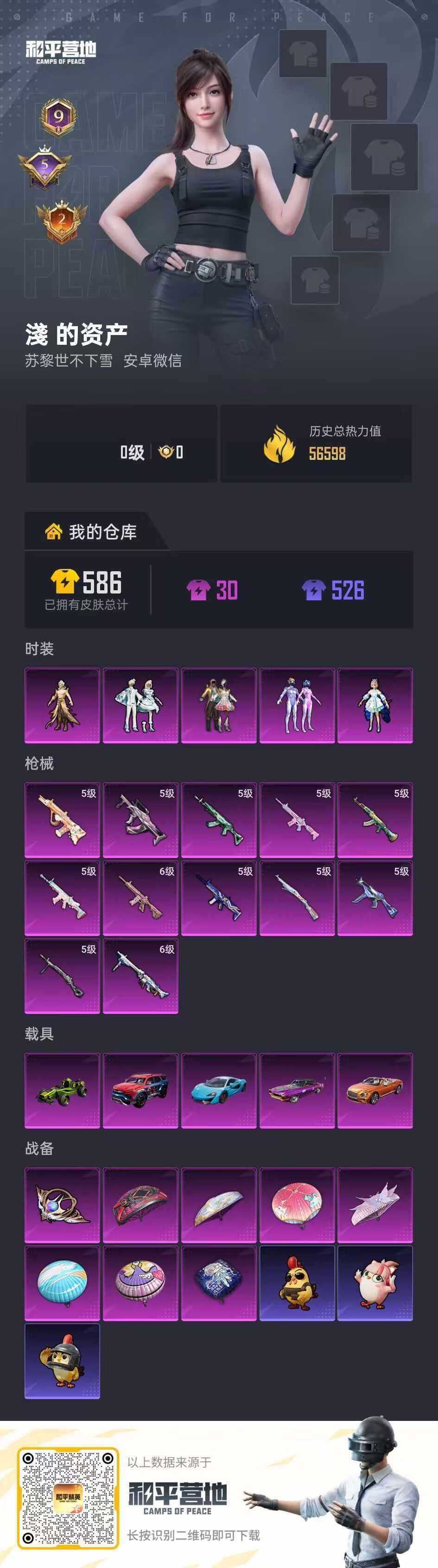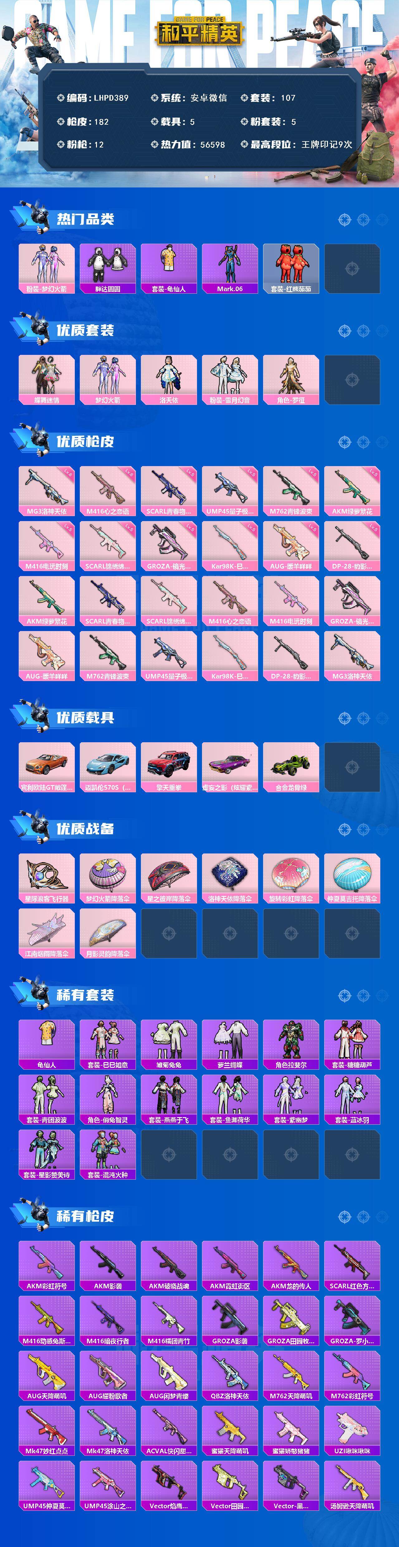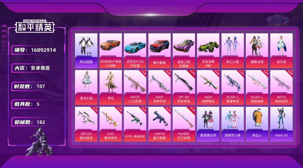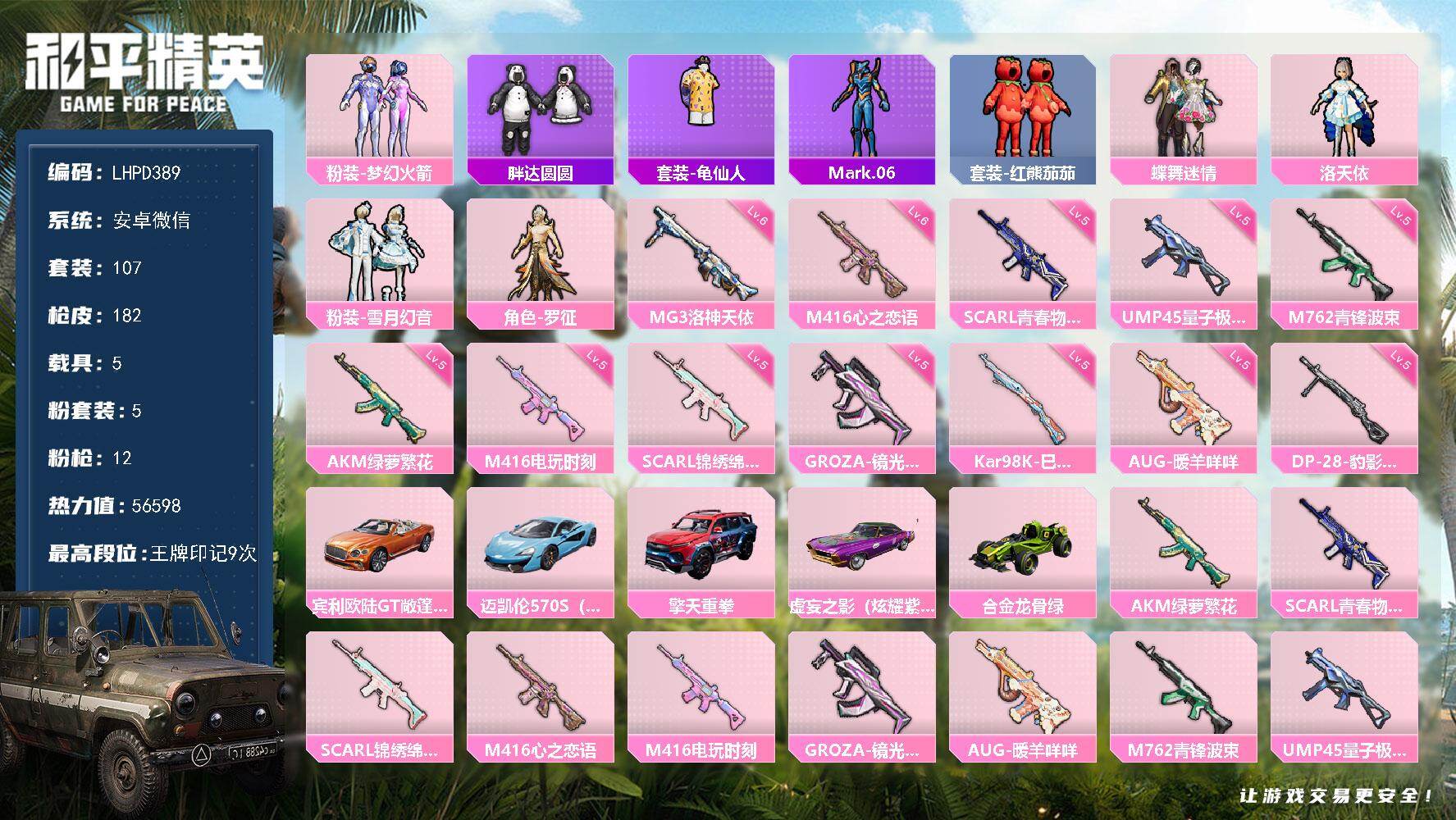 [16892914]【店主推荐捡漏号!可直接换绑】安卓 微信-5粉装-12特效枪-5载具-1粉色飞行器-56598热力值-9王牌印记-107套装-182枪皮【热门品类】:粉装-梦幻火箭,套装-胖达圆圆,套装-龟仙人,角色-Mark.06,套装-红熊茄茄【粉色套装】:粉装-蝶舞迷情,粉装-梦幻火箭,角色-洛天依,粉装-雪月幻音,角色-罗征【粉色枪皮等级】:AKM-绿萝繁花(五级),SCAR-L-青春物语(五级),SCAR-L-锦绣绵绵(五级),M416-心之恋语(六级),M416-电玩时刻(五级),GROZA-镜光银凌(五级),AUG-暖羊咩咩(五级),M762-青锋波束(五级),UMP45-量子极限(五级),Kar98K-巳巳如意(五级),DP-28-豹影疾电(五级),MG3-洛神天依(六级)【粉色载具】:宾利欧陆GT敞篷(火焰橘),迈凯伦570S(天际蓝),擎天重拳,虚妄之影(炫耀紫),合金龙骨(绿)【粉色枪皮】:AKM-绿萝繁花,SCAR-L-青春物语,SCAR-L-锦绣绵绵,M416-心之恋语,M416-电玩时刻,GROZA-镜光银凌,AUG-暖羊咩咩,M762-青锋波束,UMP45-量子极限,Kar98K-巳巳如意,DP-28-豹影疾电,MG3-洛神天依【粉色飞行器】:星际浪客飞行器