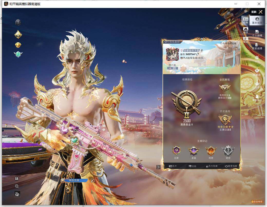- [9827313]贵族V7 无双1 珍品传说2 传说皮肤10 史诗皮肤99 皮肤数量304 皮肤价值:202680 英雄124 至圣王者