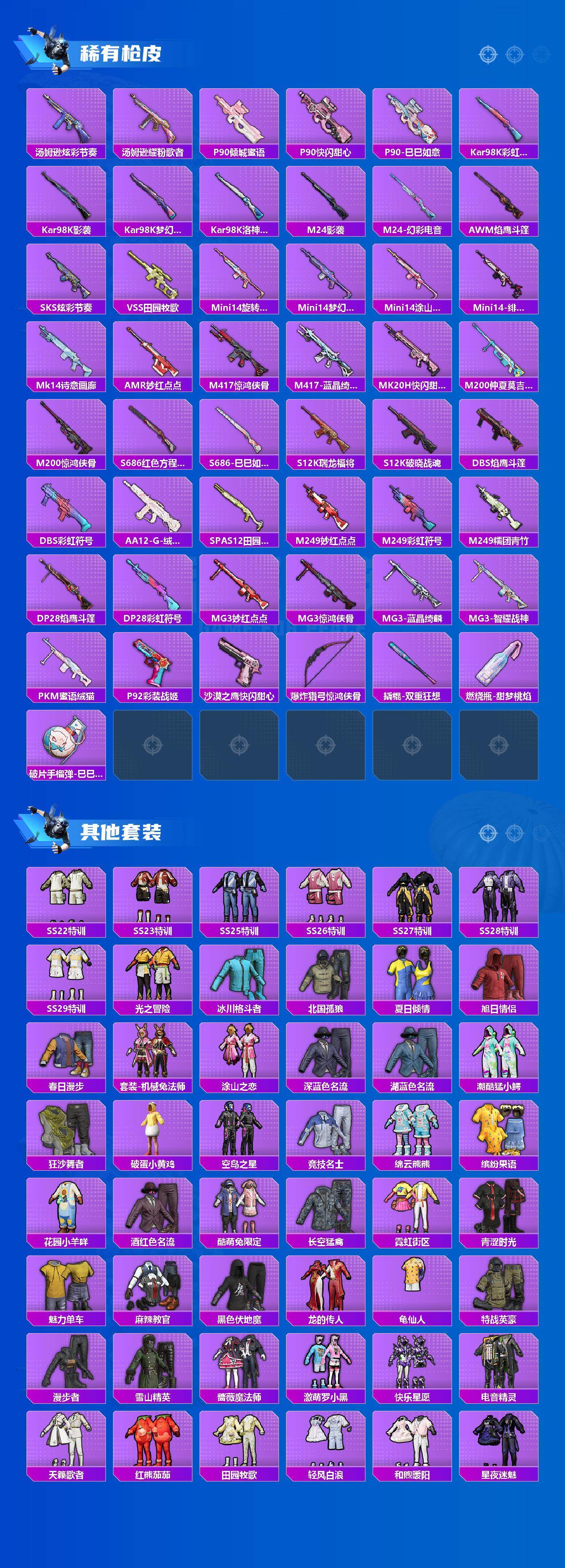 AKM-绿萝繁花,SCAR-L-青春物语,SCAR-L-锦绣绵绵,M416-心之恋语,M416-电玩时刻,GROZA-镜光银凌,AUG-暖羊咩咩,M762-青锋波束,UMP45-量子极限,Kar98K-巳巳如意,MG3-洛神天依