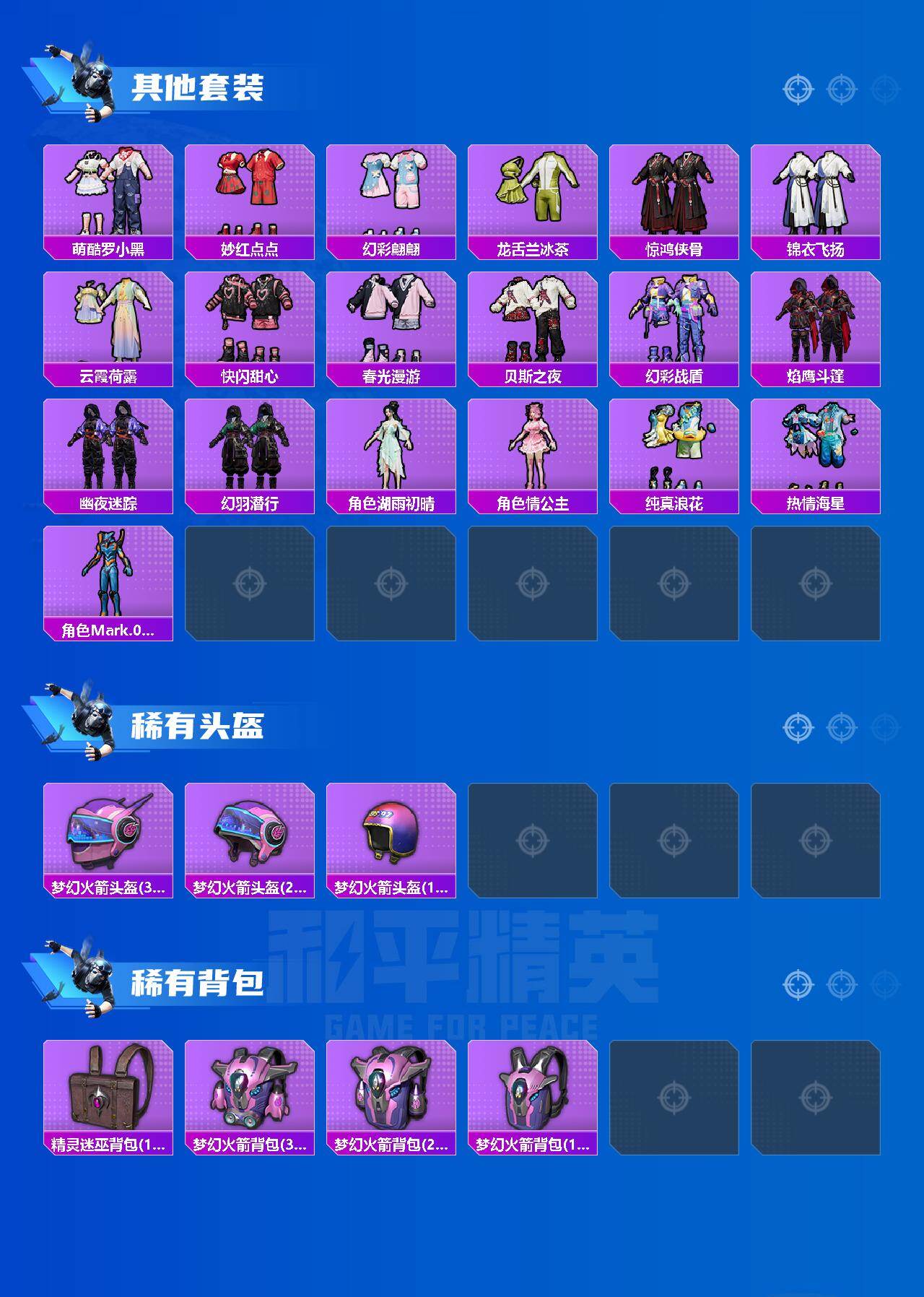 - [15913891]【特价出售/店主推荐】安卓 手Q-无敌战神框-5粉装-10特效枪-0载具-4粉色飞行器-95399热力值-23王牌印记-218套装-296枪皮 【热门品类】:套装-深海小丑鱼,套装-奇异狩猎者,套装-浪客战士,套装-AG追光队服,套装-龟仙人,套装-粉红小猪,套装-红熊茄茄 【粉色套装】:粉装-俏皮狐尾,粉装-暗星紫秘,粉装-炫光之旅,角色-千金淑猫,角色-萨利娅 【粉色枪皮等级】:AKM-梦之光华(七级),SCAR-L-梦幻火箭(七级),SCAR-L-锦绣绵绵(五级),M416-心之恋语(一级),M416-至情至圣(九级),AUG-超新星(七级),AKS-74U-信仰神谕(七级),Kar98K-巳巳如意(五级),DP-28-千金淑猫(七级),DP-28-豹影疾电(五级) 【粉色枪皮】:AKM-梦之光华,SCAR-L-梦幻火箭,SCAR-L-锦绣绵绵,M416-心之恋语,M416-至情至圣,AUG-超新星,AKS-74U-信仰神谕,Kar98K-巳巳如意,DP-28-千金淑猫,DP-28-豹影疾电 【粉色飞行器】:梦幻火箭飞行器,心之恋语飞行翼,歌者泠鸢飞行器 【粉色降落伞】:粉色回忆降落伞,梦幻火箭降落伞,神秘黑猫降落伞,古堡领主降落伞,潮汐统领降落伞,阿狸红降落伞,银刃赛罗降落伞,童趣迷兔降落伞,香水柠檬降落伞,星之彼岸降落伞,洛神天依降落伞,蓝莓炮弹降落伞,暗星紫秘降落伞,环太平洋降落伞,垂柳戏鸭降落伞,霓虹漫游降落伞,精灵梦叶罗丽降落伞,信仰神谕降落伞,樱桃泡泡降落伞,无垠阁降落伞,异瞳寒姬降落伞,炫彩糖果降落伞 【稀有套装】:套装-龟仙人,套装-巳巳如意,套装-雪国风尚,套装-炫彩糖果,套装-雏菊兔兔,套装-萝兰蝴蝶,套装-糖糖葫芦,套装-青团波波,套装-裁决天象,套装-燕燕于飞,套装-鱼渊荷华,套装-镭金极速,角色-海琴烟,角色-蜜桃派对,角色-夜瞳黯灵,套装-朱霞炽焰,套装-凌霄紫焰,角色-申公豹 【稀有枪皮】:AUG-冰晶雪宝,AKM-夜灯,AKM-奇异狩猎者,AKM-彩虹符号,AKM-影袭,AKM-星之彼岸,AKM-玉龙,AKM-环太平洋,AKM-萌趣颜团子,AKM-虎虎生威,AKM-霓虹街区,AKM-龙的传人,M16A4-凝视深渊,M16A4-夜灯,M16A4-幻世战舞者,M16A4-快乐主宰,M16A4-魔法学院,M16A4-千金淑猫,SCA