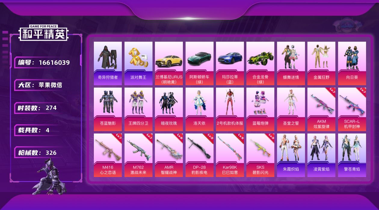 [16616039]五战神框【特价出售/店主推荐】苹果 微信-无敌战神框-10粉装-8特效枪-4载具-2粉色飞行器-12·5w热力值-31王牌印记-274套装-326枪皮 【热门品类】:套装-派对舞王,套装-奇异狩猎者,旭日初心兜帽大衣,套装-龟仙人,套装-浪漫波比,套装-粉红小猪,角色-Mark.06 【粉色套装】:粉装-蝶舞迷情,粉装-金属狂野,粉装-向日葵,粉装-苍蓝魅影,粉装-王牌四分卫,粉装-暗夜玫瑰,角色-洛天依,角色-2号机款机体服,粉装-蓝莓炮弹,角色-圣堂之誓 【粉色枪皮等级】:AKM-炫紫旋律(七级),SCAR-L-机甲封神(七级),M416-心之恋语(七级),M762-激战未来(七级),Kar98K-巳巳如意(五级),SKS-碧影闪光(五级),AMR-智耀战神(六级),DP-28-豹影疾电(五级) 【粉色载具】:兰博基尼URUS(明艳黄),阿斯顿马丁DBS(绿),玛莎拉蒂Ghibli(蓝),合金龙骨(绿) 【粉色枪皮】:AKM-炫紫旋律,SCAR-L-机甲封神,M416-心之恋语,M762-激战未来,Kar98K-巳巳如意,SKS-碧影闪光,AMR-智耀战神,DP-28-豹影疾电 【粉色飞行器】:激战未来飞行器 【粉色降落伞】:春暖花开降落伞,繁花小夜曲降落伞,心之恋语降落伞,童趣迷兔降落伞,暗夜玫瑰降落伞,洛神天依降落伞,蓝莓炮弹降落伞,碧影闪光降落伞,筑梦精灵降落伞,环太平洋降落伞,歌者泠鸢降落伞,第五大道降落伞,莲影清波降落伞,龙行天下降落伞,江南烟雨降落伞,初号机 觉醒Ver.降落伞,拳皇·狂花道降落伞,千金淑猫降落伞,冷漠罗丽降落伞,无垠阁降落伞,异瞳寒姬降落伞,炫彩糖果降落伞 【稀有套装】:套装-龟仙人,套装-炫彩糖果,套装-雏菊兔兔,套装-萝兰蝴蝶,套装-小熊娃娃,套装-糖糖葫芦,套装-青团波波,套装-棉花软糖,角色-摩登魅猫,套装-燕燕于飞,套装-鱼渊荷华,套装-紫幽梦,套装-蓝冰羽,套装-云朵鹅,套装-雪绒豹,角色-乐音,套装-朱霞炽焰,套装-凌霄紫焰,套装-擎苍青焰 【稀有枪皮】:AKM-夜灯,AKM-彩虹符号,AKM-春暖花开,AKM-灼热熔岩,AKM-玉龙,AKM-萌趣颜团子,AKM-锦绣火鲤,AKM-霓虹街区,M16A4-夜灯,M16A4-幻世战舞者,M16A4-机械英豪,M16A4-甜心亚梦,M16A4-千金淑猫,SCAR-L-炫彩节