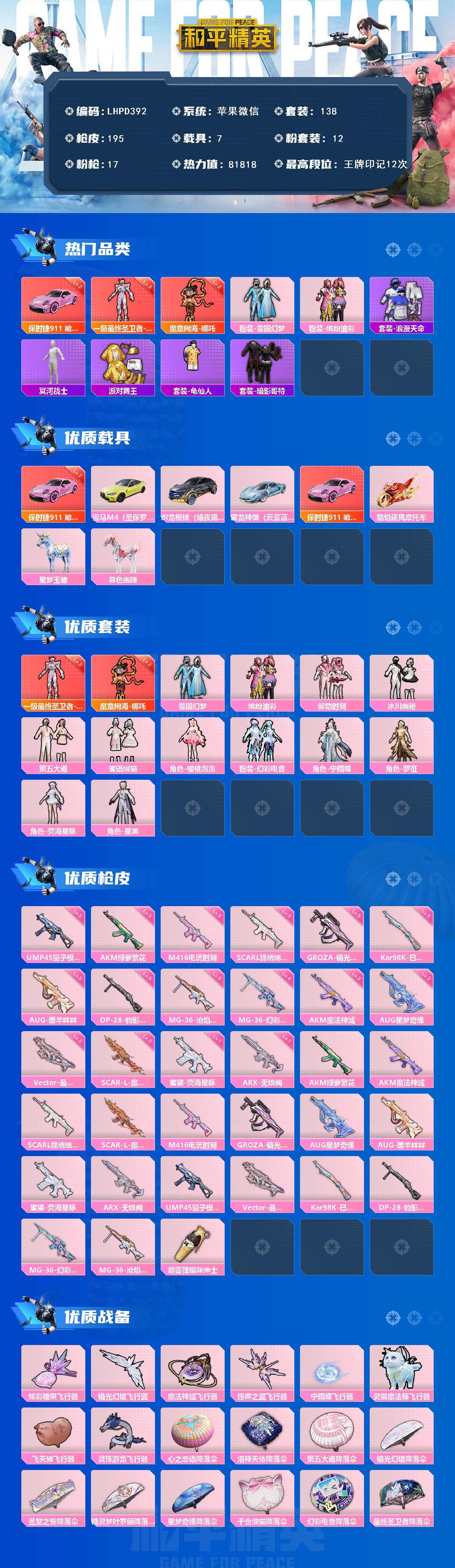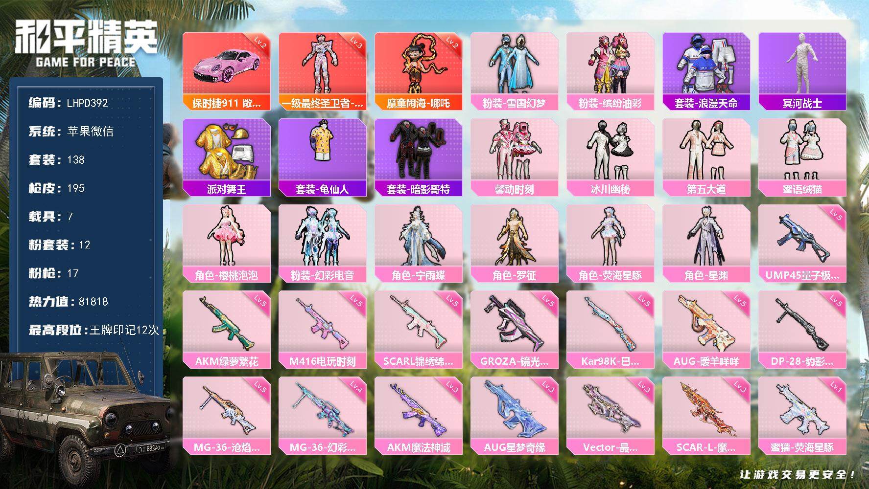 [16892893]【店主推荐捡漏号!可直接换绑】苹果 微信-2神装-12粉装-17特效枪-7载具-9粉色飞行器-81818热力值-12王牌印记-138套装-195枪皮【红色载具】:保时捷911 敞篷版(小暴龙)(二级)【红色神装等级】:魔童闹海-哪吒(二级),最终圣卫者-帕修斯(三级)【红色角色神装】:魔童闹海-哪吒,最终圣卫者-帕修斯【热门品类】:粉装-雪国幻梦,粉装-缤纷油彩,套装-浪漫天命,套装-冥河战士,套装-派对舞王,套装-龟仙人,套装-暗影哥特【粉色套装】:粉装-雪国幻梦,粉装-缤纷油彩,粉装-馨动时刻,粉装-冰川幽秘,粉装-第五大道,粉装-蜜语绒猫,角色-樱桃泡泡,粉装-幻彩电音,角色-宁雨蝶,角色-罗征,角色-荧海星豚,角色-星渊【粉色枪皮等级】:AKM-绿萝繁花(五级),AKM-魔法神域(三级),SCAR-L-锦绣绵绵(五级),SCAR-L-魔童闹海 哪吒(三级),M416-电玩时刻(五级),GROZA-镜光银凌(五级),AUG-星梦奇缘(三级),AUG-暖羊咩咩(五级),蜜獾-荧海星豚(一级),ARX-无垠阁(一级),UMP45-量子极限(五级),Vector-最终圣卫者(三级),Kar98K-巳巳如意(五级),DP-28-豹影疾电(五级),MG-36-幻彩电音(四级),MG-36-沧焰双生(五级)【粉色载具】:宝马M4(圣保罗黄),炽龙极锋(暗夜黑),霜龙神御(云雾蓝),保时捷911 敞篷版(小暴龙),踏焰逐风摩托车,星梦玉骢,暮色幽蹄【粉色枪皮】:AKM-绿萝繁花,AKM-魔法神域,SCAR-L-锦绣绵绵,SCAR-L-魔童闹海 哪吒,M416-电玩时刻,GROZA-镜光银凌,AUG-星梦奇缘,AUG-暖羊咩咩,蜜獾-荧海星豚,ARX-无垠阁,UMP45-量子极限,Vector-最终圣卫者,Kar98K-巳巳如意,DP-28-豹影疾电,MG-36-幻彩电音,MG-36-沧焰双生,烟雾弹-猫咪绅士【粉色飞行器】:炫彩糖果飞行器,镜光幻境飞行翼,魔法神域飞行器,终晖之翼飞行器,宁雨蝶飞行器,灵猫魔法师飞行器,飞天猪飞行器,灵珠游龙飞行器