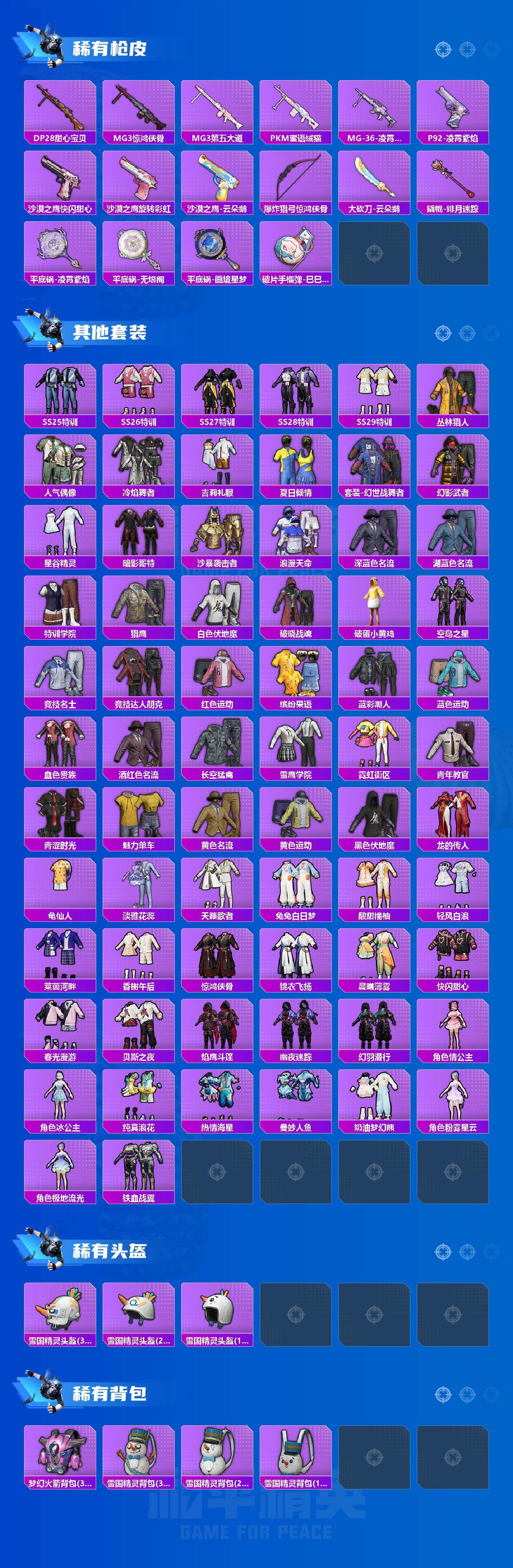- [16945004]安卓 手Q-12粉装-5特效枪-0载具-6粉色飞行器-64005热力值-10王牌印记-160套装-181枪皮 【热门品类】:粉装-梦幻火箭,套装-深海小丑鱼,套装-小丑鱼,角色-军刀雅典娜,套装-粉红小猪 【粉色套装】:粉装-甜心巧克力,粉装-宝贝奶油派,粉装-梦幻火箭,粉装-冰霜白皇,粉装-炙焰红王,粉装-恐龙拽拽,粉装-灵感创作师,粉装-旋转彩虹,粉装-冰川幽秘,粉装-寒光使者,粉装-暗夜鎏金,角色-羊梦糖心 【粉色枪皮等级】:AKM-甜心宝贝(六级),SCAR-L-童趣迷兔(六级),M249-蓝莓炮弹(四级),DP-28-暗夜鎏金(四级),DP-28-豹影疾电(五级) 【粉色枪皮】:AKM-甜心宝贝,SCAR-L-童趣迷兔,M249-蓝莓炮弹,DP-28-暗夜鎏金,DP-28-豹影疾电 【粉色飞行器】:炫彩糖果飞行器,童趣迷兔飞行器,暖熊萌萌飞行器,灵感创作师飞行器,冰川粉黛飞行器,圣域金龙飞行器 【粉色降落伞】:甜心宝贝降落伞,神秘黑猫降落伞,夏日绵绵冰降落伞,童趣迷兔降落伞,星之彼岸降落伞,暗夜玫瑰降落伞,蓝莓炮弹降落伞,橘柚倾心降落伞,圣光天使降落伞,环太平洋降落伞,灵感创作师降落伞,暗夜鎏金降落伞,圣域龙灵降落伞,智耀战神降落伞,无垠阁降落伞,异瞳寒姬降落伞,炫彩糖果降落伞 【稀有套装】:套装-炫彩糖果,角色-瑰梦爱神,套装-彩虹兔,套装-云朵鹅,套装-雪绒豹,角色-灵公主,角色-绛羽幽主,套装-朱霞炽焰,套装-凌霄紫焰,套装-擎苍青焰,角色-绯色魅影,角色-紫俏灵猫 【稀有枪皮】:AKM-彩虹符号,AKM-王牌投手,AKM-缤纷海域,AKM-虎虎生威,AKM-龙的传人,M16A4-幻世战舞者,M16A4-甜心亚梦,SCAR-L-炫彩节奏,SCAR-L-玉兔迎春,SCAR-L-红色方程式,SCAR-L-龙宫之主,M416-红色方程式,M416-蓝色火焰,GROZA-异彩先驱,GROZA-彩虹符号,GROZA-影袭,GROZA-梨园星光,GROZA-田园牧歌,GROZA-蓝莓炮弹,AUG-耀粉歌者,AUG-青春冒险家,QBZ-彩虹符号,QBZ-洛神天依,QBZ-相思残雪,QBZ-飞驰魅影,M762-天降萌叽,M762-彩虹甜喵,M762-暖熊萌萌,M762-暗夜鎏金,M762-瑞龙福将,M762-云朵鹅,Mk47-青春冒险家,G36C-暗夜玫瑰,AC-