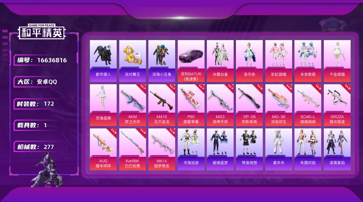 [16636816]【特价出售/店主推荐】安卓 手Q-6粉装-12特效枪-1载具-4粉色飞行器-82413热力值-17王牌印记-172套装-277枪皮【热门品类】:套装-浪漫天命,套装-都市猎人,套装-派对舞王,套装-深海小丑鱼,套装-龟仙人,套装-暗影哥特,角色-Mark.06【粉色套装】:粉装-冰霜白皇,角色-洛天依,粉装-彩虹甜喵,粉装-未来歌姬,角色-千金淑猫,角色-荧海星豚【粉色枪皮等级】:AKM-梦之光华(七级),SCAR-L-锦绣绵绵(五级),M416-五爪金龙(七级),GROZA-镜光银凌(五级),AUG-暖羊咩咩(五级),AKS-74U-森灵之息(五级),P90-甜蜜草莓(七级),Kar98K-巳巳如意(五级),Mk14-甜梦熊击(五级),DP-28-豹影疾电(五级),MG3-洛神天依(七级),MG-36-沧焰双生(五级)【粉色载具】:宾利BATUR(极速紫)【粉色枪皮】:AKM-梦之光华,SCAR-L-锦绣绵绵,M416-五爪金龙,GROZA-镜光银凌,AUG-暖羊咩咩,AKS-74U-森灵之息,P90-甜蜜草莓,Kar98K-巳巳如意,Mk14-甜梦熊击,DP-28-豹影疾电,MG3-洛神天依,MG-36-沧焰双生【粉色飞行器】:祥瑞锦鲤飞行器,宁雨蝶飞行器,极意拳锋飞行器