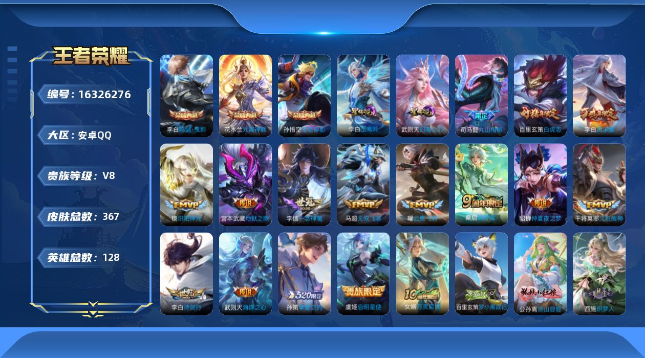 [16326276]安卓Q-367皮肤-3典藏皮肤-1典藏英雄-15传说-104史诗 【英雄全皮】:钟馗全皮,雅典娜全皮,影全皮 【荣耀典藏】:武则天英雄,孙悟空全息碎影,李白鸣剑曳影,花木兰九霄神辉 【传说皮肤】:司马懿九山相柳,桑启鸣野蒿,李白诗剑行,马超无双飞将,孙策挚爱之约,镜炽阳神光,虞姬启明星使,曜云鹰飞将,李信一念神魔,干将莫邪久胜战神,百里玄策白虎志,貂蝉仲夏夜之梦,李白凤求凰,宫本武藏地狱之眼,武则天海洋之心 【限定皮肤】:白起狰,姜子牙天穹之誓,狄仁杰阴阳师,虞姬凯尔特女王,赵云皇家上将,墨子神迹守卫,妲己时之彼端,嬴政白昼王子,孙尚香蔷薇恋人,鲁班七号狮舞东方,庄周蜃楼王,庄周高山流水,高渐离死亡摇滚,高渐离玩趣恶龙,阿轲迷踪丽影,钟无艳超时空战士,孙膑妖精王,扁鹊炼金王,扁鹊奇幻香踪,白起夜都怪侠,芈月重明,吕布猎兽之王,周瑜赤莲之焰,元歌云间偶戏,元歌无心,夏侯惇朔风刀,甄姬游园惊梦,甄姬落雪兰心,曹操烛龙,典韦穷奇,典韦蓝屏警告,典韦岱宗,马可波罗暗影游猎,狄仁杰魔术师,狄仁杰万华元夜,达摩星际陆战队,达摩沙漠行僧,项羽海滩派对,老夫子圣诞老人,老夫子醍醐杖,老夫子航海奇遇记,程咬金演武夺筹,刘邦夺宝奇兵,韩信飞衡,王昭君午后时光,兰陵王驯魔猎人,兰陵王金庭之子,亚瑟潮玩骑士王,牛魔御旌,后羿圣弓游侠,李元芳银河之约,李元芳云中旅人,虞姬启明星使,钟馗神迹守卫,钟馗驱傩正仪,杨玉环遇见飞天,杨戬潮玩骑兵,女娲朔望之晖,雅典娜单词大作战,雅典娜黎明之约,蔡文姬繁星吟游,太乙真人饕餮,鬼谷子原初探秘者,鬼谷子五谷丰年,百里玄策白虎志,百里玄策原初追逐者,弈星混沌棋,梦奇顽趣,沈梦溪星空之诺,沈梦溪大漠名商,明世隐疑决卦,明世隐吟游魔法,裴擒虎李小龙,裴擒虎擒涛扼浪,狂铁御狮,狂铁电玩高手,米莱狄御霄,米莱狄胡桃异想国,云中君纤云弄巧,伽罗天狼溯光者,盾山御銮,孙策挚爱之约,猪八戒西部大镖客,上官婉儿梁祝,上官婉儿天狼绘梦者,嫦娥暖冬兔眠,西施玲珑珍味,蒙犽狂想玩偶喵,鲁班大师探海日志,桑启海盐诗旅,暃星界游侠,戈娅驭风魔法,艾琳流音漫舞,司空震地狱燃心,阿古朵江河有灵,张良古海寻踪,蒙恬荣光圣徽,鬼谷子天穹祈灯,沈梦溪龙舞盛年,刘邦剑破天穹,程咬金群星魔术团,周瑜熔金海岸 【年限皮肤】:百里玄策白虎志,李白凤求凰,韩信飞衡,典韦岱宗,马超神威 【赛季限定】:庄