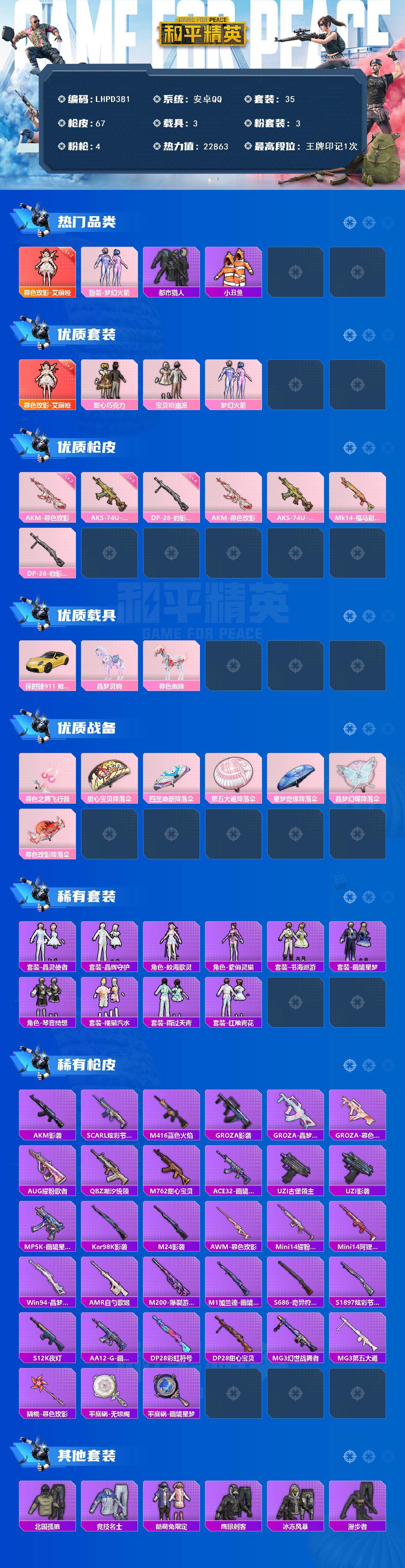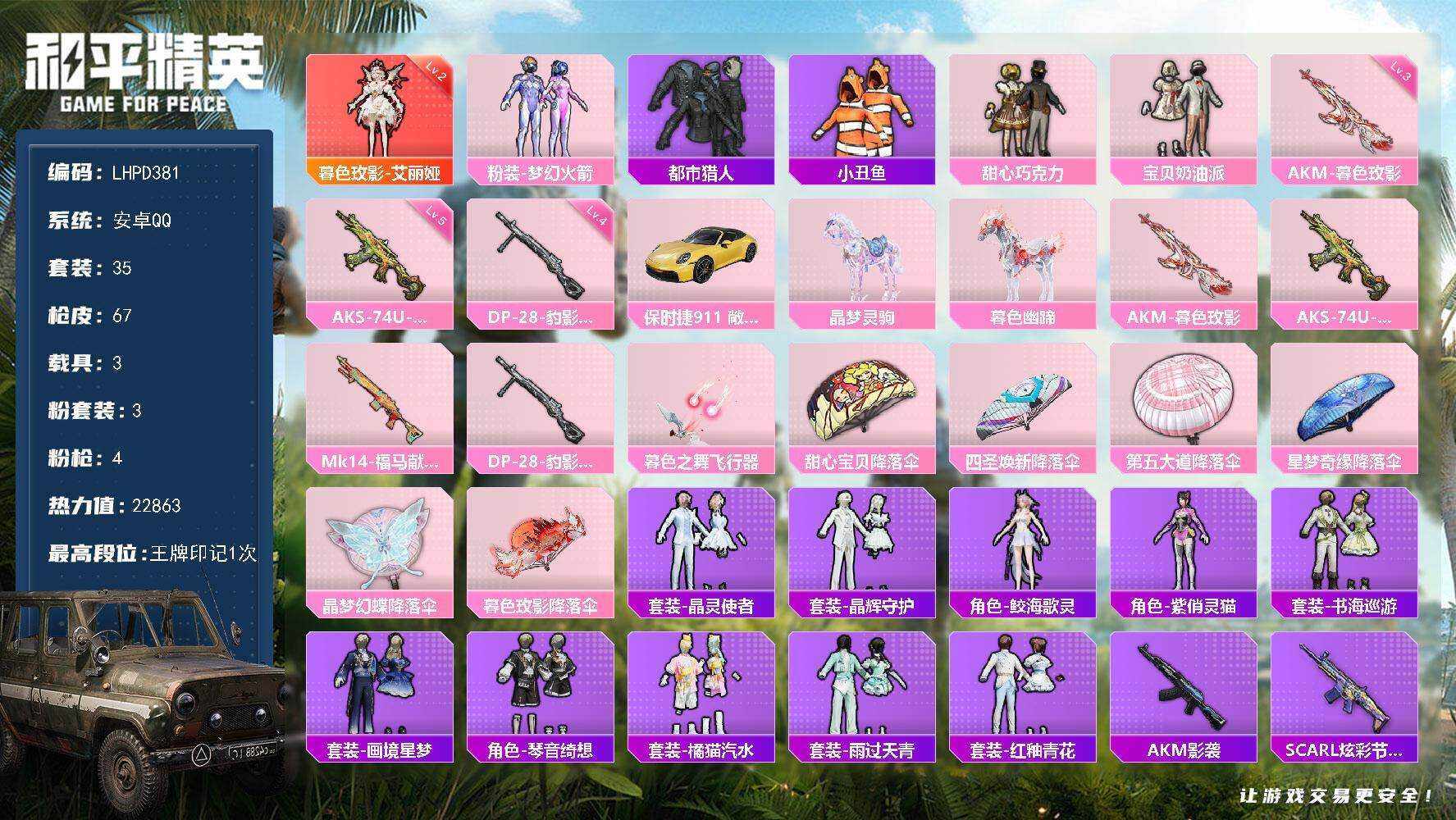 [16892931]【店主推荐捡漏号!可直接换绑】安卓 手Q-1神装-3粉装-4特效枪-3载具-1粉色飞行器-22863热力值-1王牌印记-35套装-67枪皮【红色神装等级】:暮色玫影-艾丽娅(二级)【红色角色神装】:暮色玫影-艾丽娅【热门品类】:粉装-梦幻火箭,套装-都市猎人,套装-小丑鱼【粉色套装】:粉装-甜心巧克力,粉装-宝贝奶油派,粉装-梦幻火箭【粉色枪皮等级】:AKM-暮色玫影(三级),AKS-74U-森灵之息(五级),DP-28-豹影疾电(四级)【粉色载具】:保时捷911 敞篷版(极速黄),晶梦灵驹,暮色幽蹄【粉色枪皮】:AKM-暮色玫影,AKS-74U-森灵之息,Mk14-福马献瑞,DP-28-豹影疾电【粉色飞行器】:暮色之舞飞行器