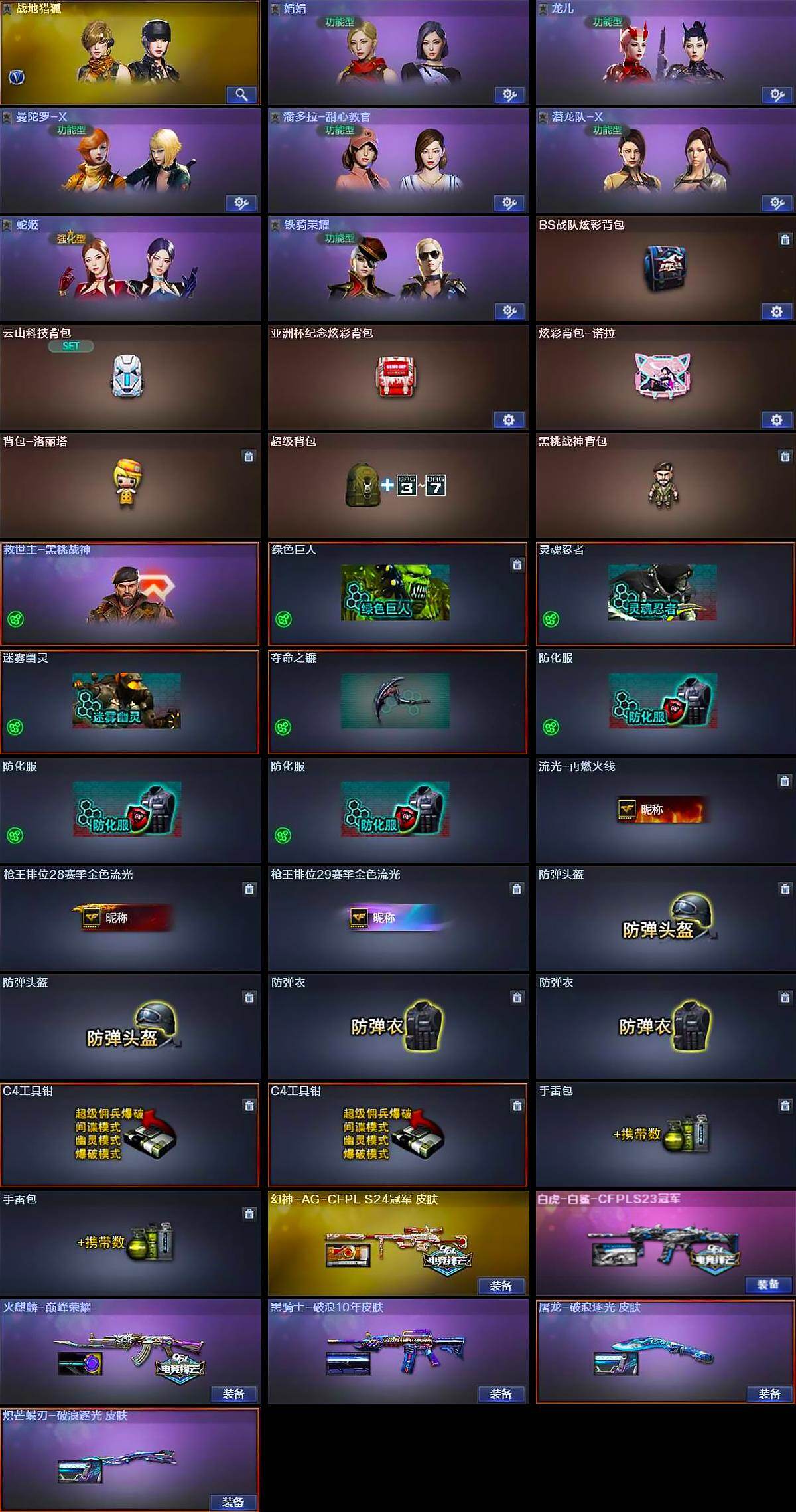 【道具】:BS战队炫彩背包,云山科技背包,亚洲杯纪念炫彩背包,炫彩背包-诺拉,背包-洛丽塔,超级背包,黑桃战神背包,救世主-黑桃战神,绿色巨人,灵魂忍者,迷雾幽灵,夺命之镰,防化服*3,流光-再燃火线,枪王排位28赛季金色流光,枪王排位29赛季金色流光,防弹头盔*2,防弹衣*2,C4工具钳*2,手雷包*2