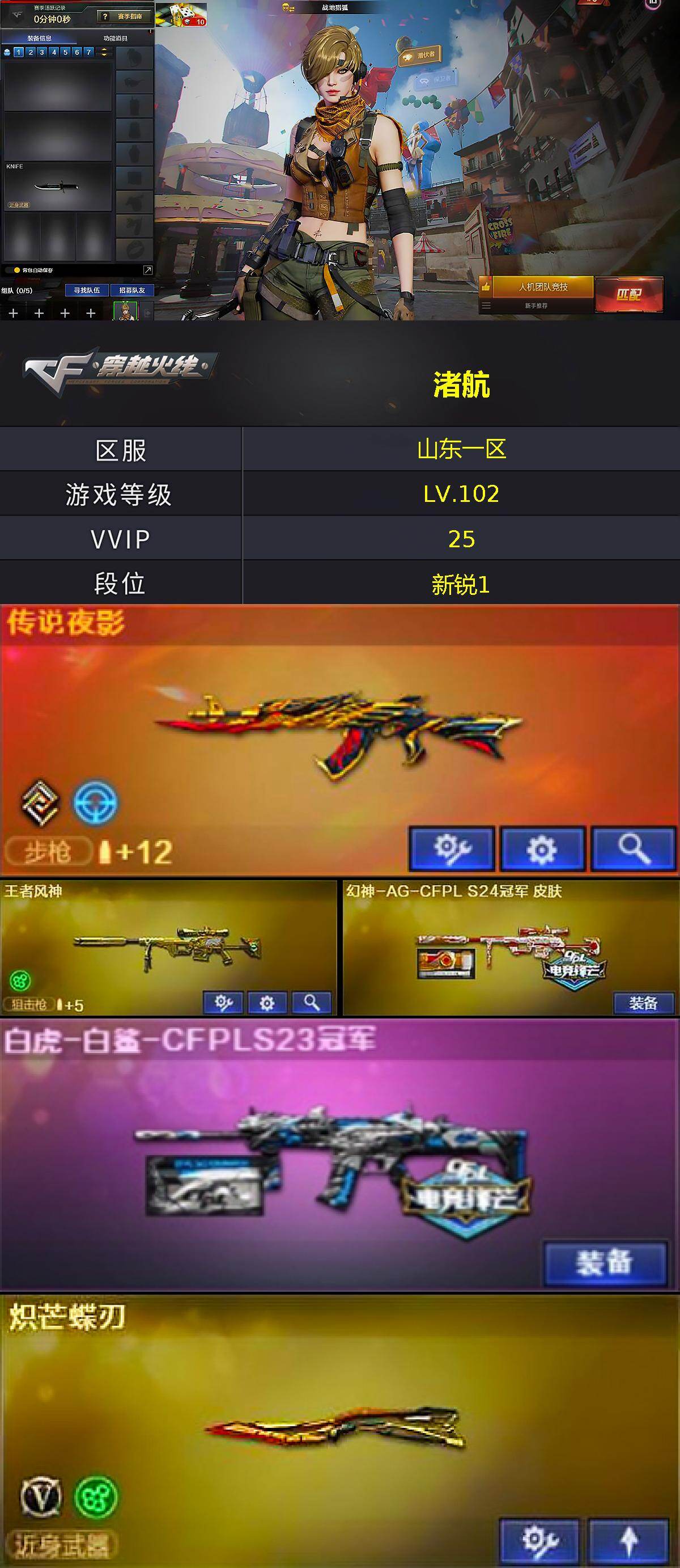 [17042899]山东一区-25V-1王者武器数-0炫金武器数 【传说武器】:传说夜影 【热门武器】:传说夜影,炽芒蝶刃,炽芒蝶刃-破浪逐光 皮肤 【王者炫金武器】:王者风神 【皮肤】:幻神-AG-CFPL S24冠军 皮肤,白虎-白鲨-CFPLS23冠军,火麒麟-巅峰荣耀,黑骑士-破浪10年皮肤,屠龙-破浪逐光 皮肤,炽芒蝶刃-破浪逐光 皮肤 【角色】:战地猎狐,娟娟,龙儿,曼陀罗-X,潘多拉-甜心教官,潜龙队-X,蛇姬,铁骑荣耀,兔囡囡 【人偶武器】:灵狐娃娃手雷 【英雄级武器】:AK47-火麒麟,黑骑士-海王,屠龙,擎天-竞技荣光*2,炽芒蝶刃,高爆手雷-竞技荣光*6,闪光弹-竞技荣光*8,烟雾弹-竞技荣光*2 【道具】:BS战队炫彩背包,云山科技背包,亚洲杯纪念炫彩背包,炫彩背包-诺拉,背包-洛丽塔,超级背包,黑桃战神背包,救世主-黑桃战神,绿色巨人,灵魂忍者,迷雾幽灵,夺命之镰,防化服*3,流光-再燃火线,枪王排位28赛季金色流光,枪王排位29赛季金色流光,防弹头盔*2,防弹衣*2,C4工具钳*2,手雷包*2 【特殊枪械】: