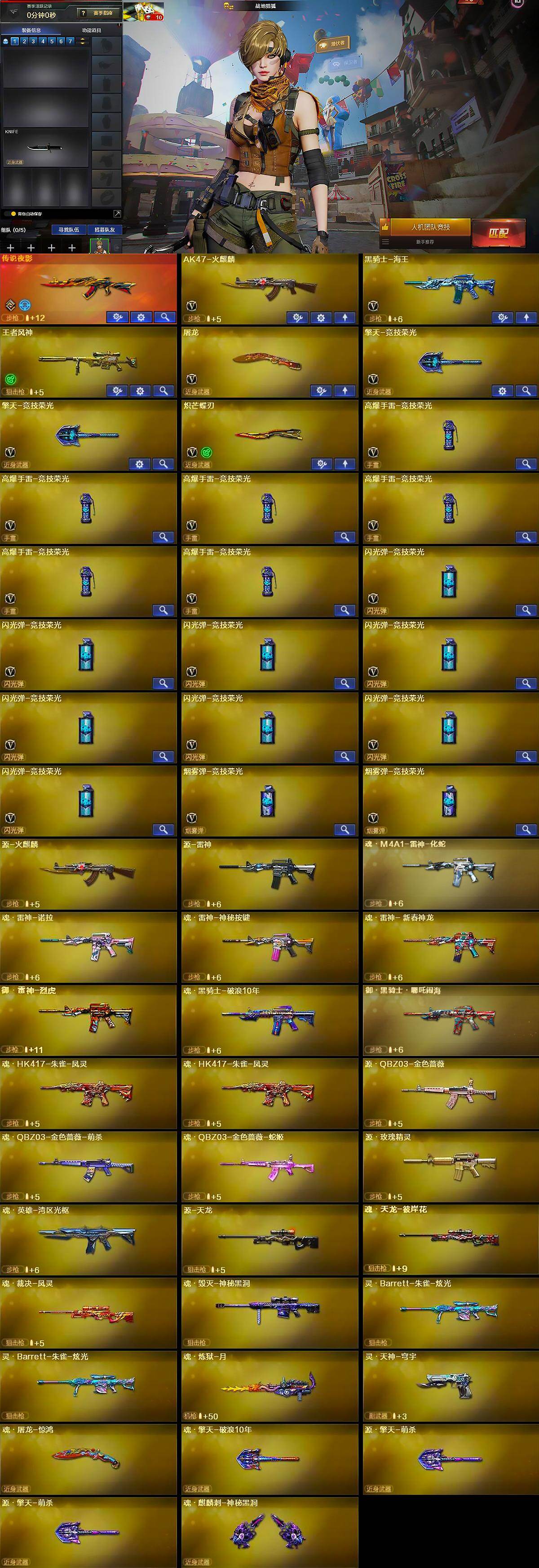 【英雄级武器】:AK47-火麒麟,黑骑士-海王,屠龙,擎天-竞技荣光*2,炽芒蝶刃,高爆手雷-竞技荣光*6,闪光弹-竞技荣光*8,烟雾弹-竞技荣光*2
