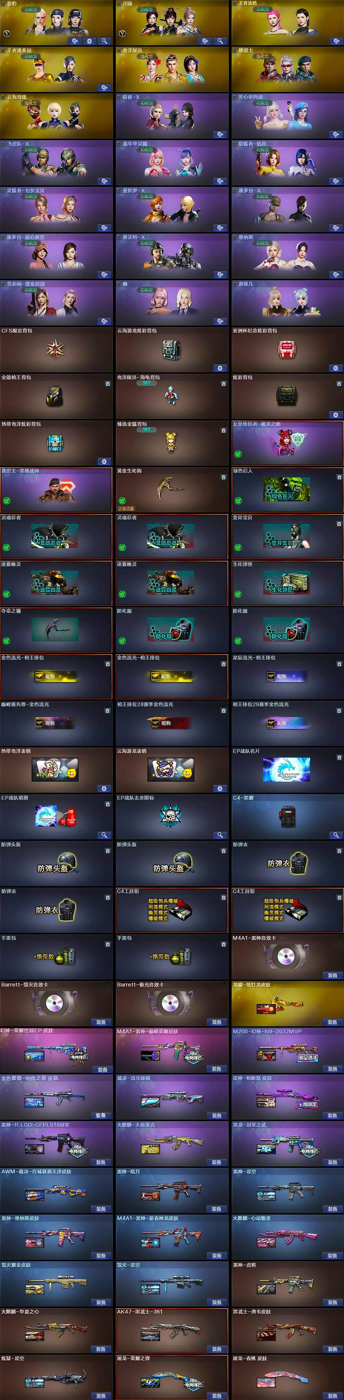 【皮肤】:M200-幻神-N9-2022MVP,幻神-荣耀世冠EP 皮肤,金色蔷薇-电竞之星 皮肤,裁决-流光秘银,AWM-裁决-百城联赛天津皮肤,星神-枪娘默 皮肤,雷神-暗月,雷神-星空,雷神-虎将,雷神-R.LGD-CFPLS18冠军,雷神-维纳斯皮肤,M4A1-雷神-新春神龙皮肤,M4A1-雷神-巅峰荣耀皮肤,火麒麟-华夏之心,火麒麟-大唐荣光,火麒麟-心动糖果,毁灭耀金皮肤,毁灭-星空,毁灭-英雄计划 皮肤,黑龙-冠军之武,AK47-黑武士-361,黑武士-典韦皮肤,炼狱-星空,屠龙-荣耀之锋,屠龙-春桃 皮肤,龙啸-纸灯龙皮肤