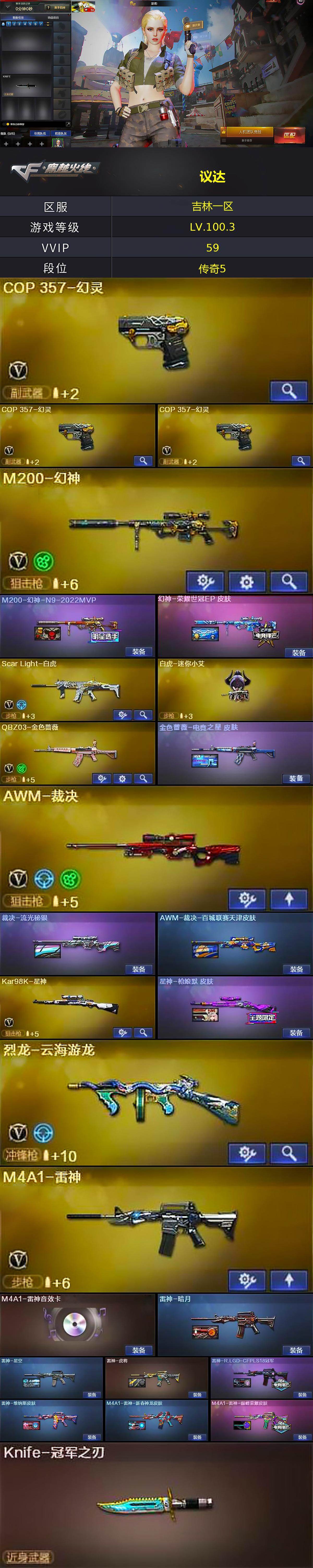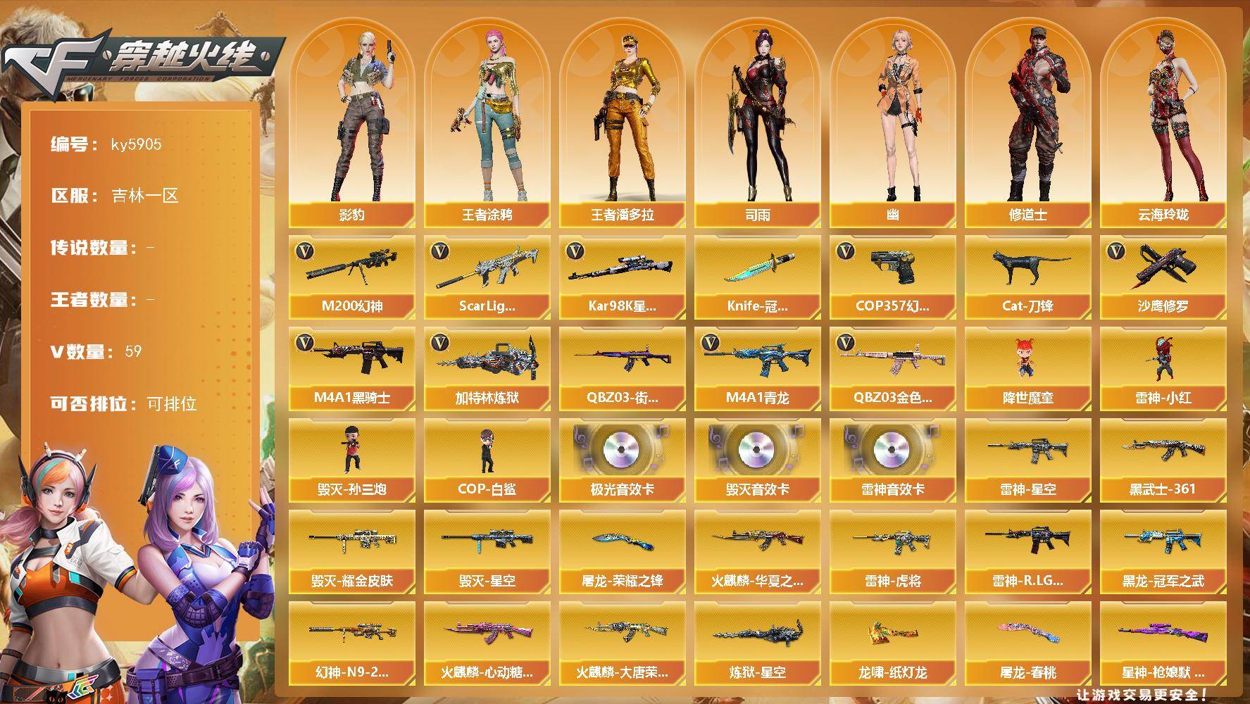 [17043090]吉林一区-56V-0王者武器数-0炫金武器数 【热门武器】:QBZ03-金色蔷薇,Scar Light-白虎,M4A1-青龙,M200-幻神,QBZ03-街机,Kar98K-星神,Cat-刀锋,M4A1-黑骑士,加特林-炼狱,降世魔童,雷神-小红,毁灭-孙三炮,COP-白鲨,COP 357-幻灵*3,沙鹰-修罗,Knife-冠军之刃 【音效卡】:M4A1-雷神音效卡,Barrett-毁灭音效卡,Barrett-极光音效卡 【皮肤】:M200-幻神-N9-2022MVP,幻神-荣耀世冠EP 皮肤,金色蔷薇-电竞之星 皮肤,裁决-流光秘银,AWM-裁决-百城联赛天津皮肤,星神-枪娘默 皮肤,雷神-暗月,雷神-星空,雷神-虎将,雷神-R.LGD-CFPLS18冠军,雷神-维纳斯皮肤,M4A1-雷神-新春神龙皮肤,M4A1-雷神-巅峰荣耀皮肤,火麒麟-华夏之心,火麒麟-大唐荣光,火麒麟-心动糖果,毁灭耀金皮肤,毁灭-星空,毁灭-英雄计划 皮肤,黑龙-冠军之武,AK47-黑武士-361,黑武士-典韦皮肤,炼狱-星空,屠龙-荣耀之锋,屠龙-春桃 皮肤,龙啸-纸灯龙皮肤 【角色】:影豹,司雨,王者涂鸦,王者潘多拉,奇洋探员,修道士,云海玲珑,暗夜-X,芳心审判者,飞虎队-X,嘉年华灵狐,猎狐者-追月,灵狐者-七夕宝贝,曼陀罗-X,潘多拉-X,潘多拉-甜心教官,斯沃特-X,维纳斯,雪莉杨-摸金校尉,樱-缤纷夏日,幽,游珑儿 【人偶武器】:雷神-小红,COP-白鲨,毁灭-孙三炮,白虎-迷你小艾,火麒麟-灵狐,AWM-灵狐-15周年嘉年华,Cat-刀锋,迷你波特博士,夺魂,迷你牛牛,迷你火种,生化手雷-机甲核心,QBZ03-斯沃特,降世魔童 【暴走生化】:超级对讲机 【挑战大师】:冰龙粉碎者-白马银枪,激光毁灭者III-白马银枪,试炼破坏者III 【英雄级武器】:AK47-火麒麟,M4A1-黑龙,M4A1-雷神,M4A1-黑骑士,AK47-黑鲨,M4A1-青龙,Scar Light-白虎,黑武士-锦绣游龙,超新星-热带奇洋,QBZ03-金色蔷薇,AWM-天龙,Barrett-毁灭,Barrett-极光,AWM-裁决,M200-幻神,Kar98K-星神,加特林-炼狱,烈龙-云海游龙,沙鹰-修罗,COP 357-幻灵*3,屠龙,龙啸,麒麟刺-堕天神,麒麟刺,幻灵之锋*2,擎天-云海游龙,