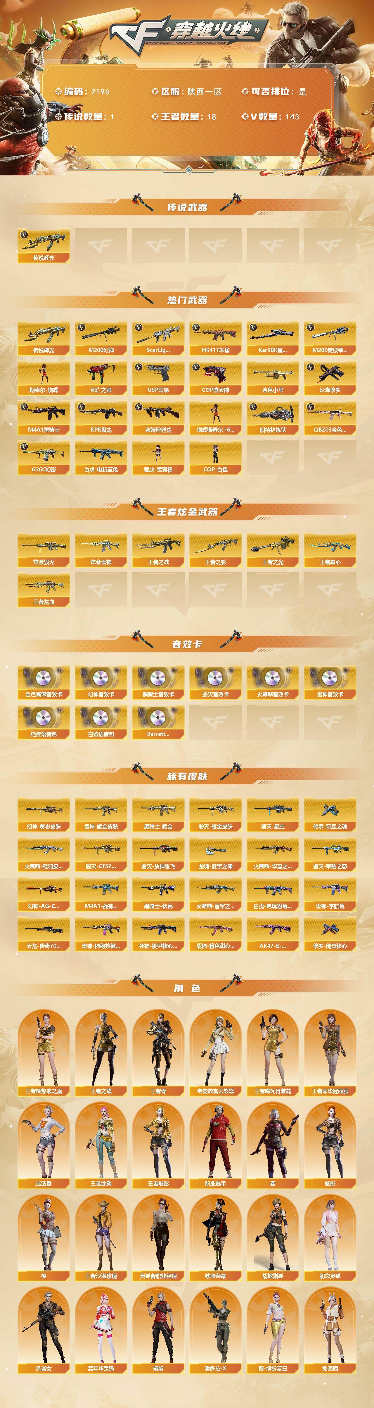 - [16531848]陕西一区-78V-22王者-4炫金 【热门武器】:QBZ03-金色蔷薇,HK417-朱雀,M4A1-青龙,M200-幻神,死亡之眼,M4A1-黑骑士,汤姆逊-烈龙*6,RPK-盘龙*5,加特林-炼狱*3,沙鹰-修罗*5,柯尔特-赛博朋克 【王者炫金武器】:王者之戮,王者之幻,王者之武,王者之影,炼狱-悦蓝,王者之灵*2,王者之锋,炫金毁灭,炫金天龙,炫金修罗*2 【音效卡】:M200-幻神音效卡,AK47-火麒麟音效卡,M4A1-雷神音效卡,M4A1-黑骑士音效卡,Barrett-毁灭音效卡*2 【皮肤】:幻神-宠儿-2021MVP,白虎-AG-CFPLS20冠军,雷神-荣耀之魄,雷神-星空,AK47-火麒麟-传奇EVEN,火麒麟-战神关羽*2,火麒麟-心动糖果,黑龙-墨子皮肤,黑骑士-地狱火,战神-粉色甜心皮肤,战神-流金岁月皮肤,AK47-B-常胜将军-刘备*2,AK47-B-常胜将军-孙权*2,AWM-天龙-传奇70KG,修罗-能量核心*2,擎天-冠军之击,麒麟刺-甜蜜糖果 皮肤 【角色】:樱,魅影,关小雨,王者-瞳-闭月羞花,王者涂鸦,乔伊教练,空,暗夜-X,初恋灵狐,电竞少女,芳心审判者,风暴女,嘉年华灵狐,荆棘玫瑰,兰-空鹰,零-热舞青春,潘多拉-X,潘多拉-甜心教官,斯沃特-X,铁骑荣耀,新娜塔莎,影武者-X,职业选手,雅典娜 【人偶武器】:火麒麟-灵狐*2,M4A1-雷神-精英刀锋,AWM-灵狐-15周年嘉年华,COP-旗袍,迷你裂空之翼*4,夺魂*2,迷你牛牛,深渊终结者手雷,闪光弹-小乔,闪光弹-貂蝉,高爆手雷-大乔,迷你艾比 【暴走生化】:死亡之眼,超级对讲机 【挑战大师】:神圣爆裂者III,冰龙粉碎者-白马银枪,激光毁灭者III-白马银枪,VEPR-12-金魔,激光毁灭者III,阐释者III*2 【英雄级武器】:AK47-火麒麟*2,M4A1-黑龙,M4A1-雷神*2,M4A1-黑骑士,AN94-超新星,M4A1-龙血,M4A1-青龙,HK417-朱雀,无影-神兵利器,黑武士-锦绣游龙,QBZ03-金色蔷薇,烈火-动感闪耀,王者之魄-觉醒版,王者之势-觉醒版,AK-47-猩红传说*2,王者炎心-觉醒版,黑骑士-海王,AK47-B-常胜将军,Barrett-毁灭,Barrett-极光,AWM-裁决,M200-幻神,王者之力-觉醒版,RPK-盘
