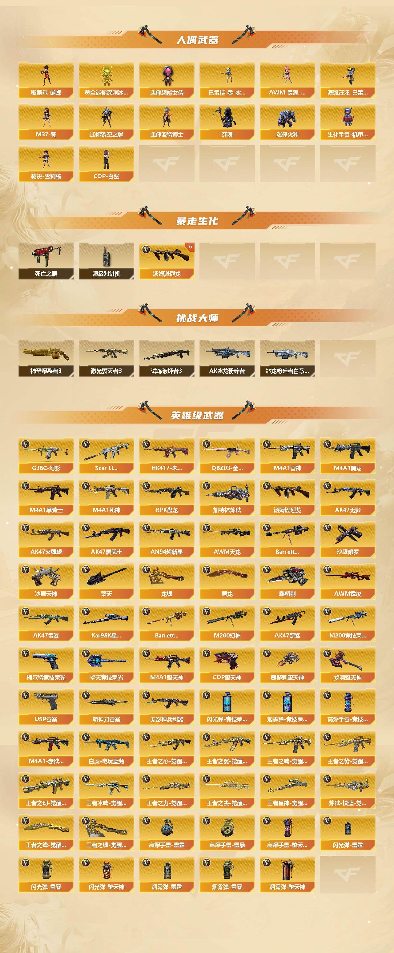 【英雄级武器】:AK47-火麒麟,M4A1-黑龙*2,M4A1-雷神,M4A1-