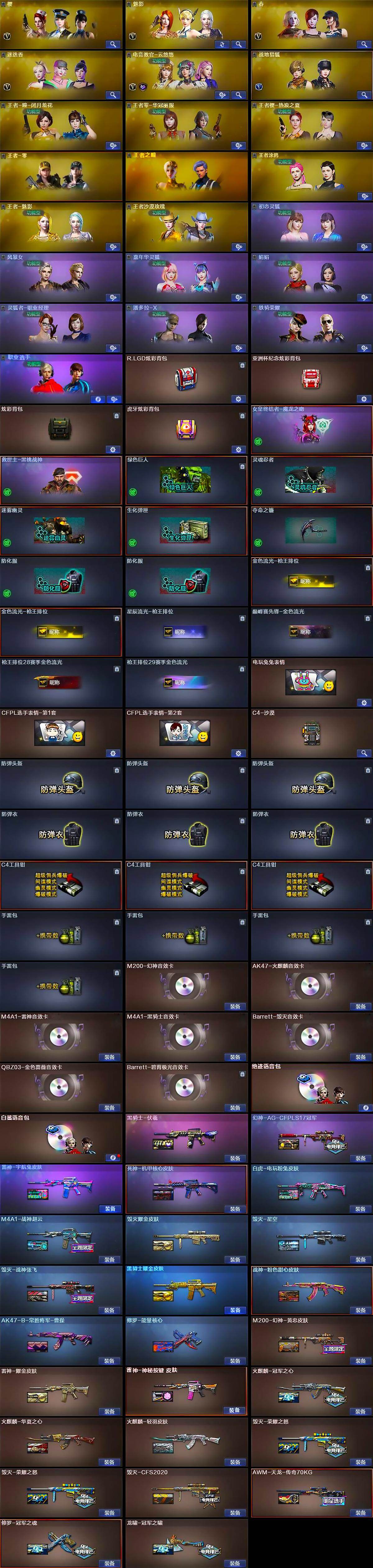 【皮肤】:M200-幻神-黄忠皮肤,幻神-AG-CFPLS17冠军,白虎-电玩粉兔皮肤,雷神-耀金皮肤,M4A1-战神赵云,雷神-宇航兔皮肤,雷神-神秘按键 皮肤,火麒麟-冠军之心,火麒麟-华夏之心,火麒麟-轻羽皮肤,毁灭-荣耀之怒*2,毁灭耀金皮肤,毁灭-星空,毁灭-CFS2020,毁灭-战神张飞,黑骑士耀金皮肤,黑骑士-伏羲,死神-机甲核心皮肤,战神-粉色甜心皮肤,AK47-B-常胜将军-曹操,AWM-天龙-传奇70KG,修罗-能量核心,修罗-冠军之魂,龙啸-冠军之啸