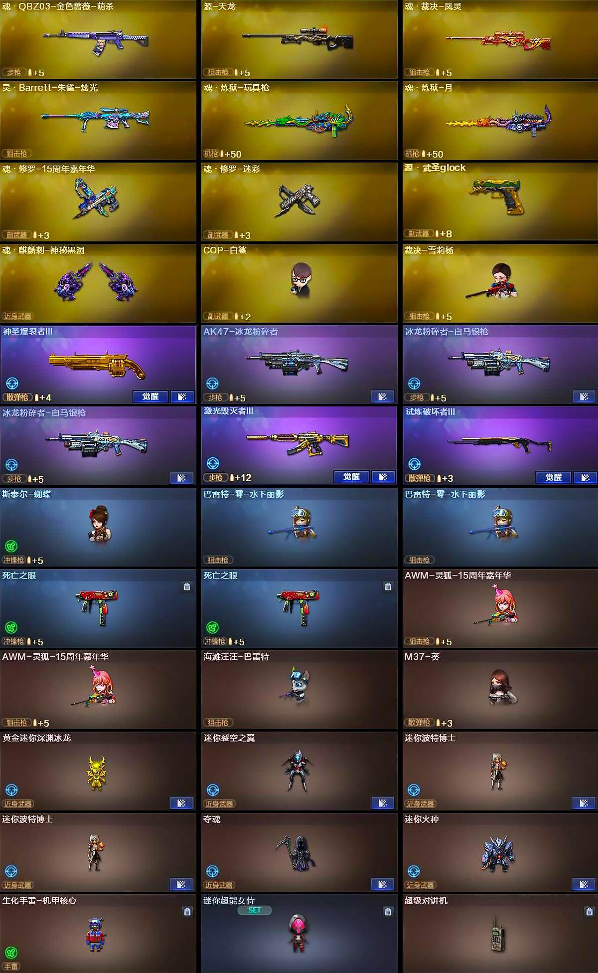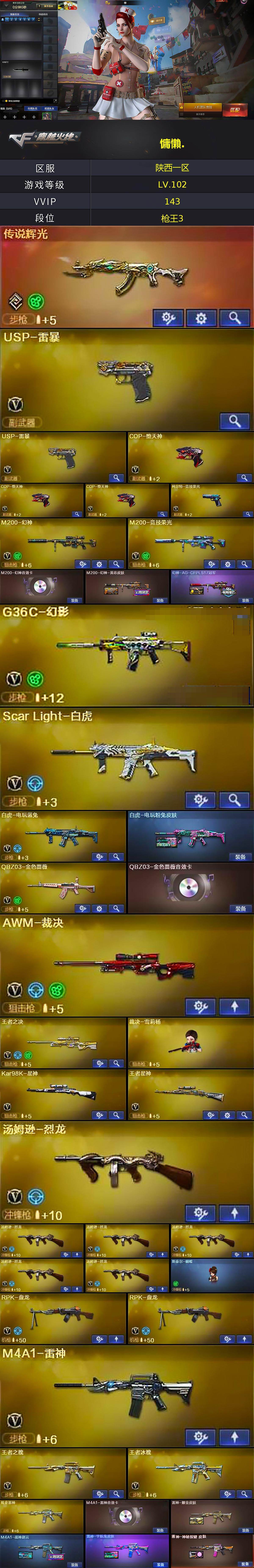 【热门武器】:传说辉光,G36C-幻影,QBZ03-金色蔷薇,Scar Light-白虎,HK417-朱雀,M200-幻神,M200-竞技荣光,死亡之眼*2,白虎-电玩蓝兔,Kar98K-星神,金色小号,M4A1-黑骑士*2,汤姆逊-烈龙*6,RPK-盘龙*2,加特林-炼狱*3,斯泰尔-蝴蝶,裁决-雪莉杨,COP-白鲨,USP-雷暴*2,COP-堕天神*3,沙鹰-修罗*2