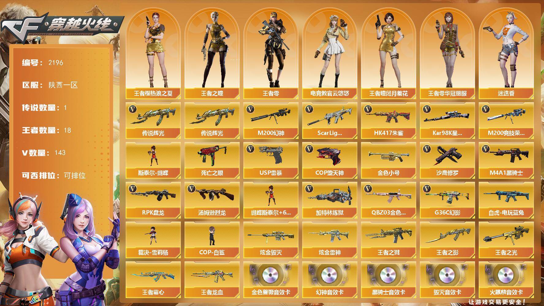 [17043996]陕西一区-156V-18王者武器数-2炫金武器数 【传说武器】:传说辉光 【热门武器】:传说辉光,G36C-幻影,QBZ03-金色蔷薇,Scar Light-白虎,HK417-朱雀,M200-幻神,M200-竞技荣光,死亡之眼*2,白虎-电玩蓝兔,Kar98K-星神,金色小号,M4A1-黑骑士*2,汤姆逊-烈龙*6,RPK-盘龙*2,加特林-炼狱*3,斯泰尔-蝴蝶,裁决-雪莉杨,COP-白鲨,USP-雷暴*2,COP-堕天神*3,沙鹰-修罗*2 【王者炫金武器】:王者之戮,王者之影,王者霜心,王者龙血,王者之光*2,炫金雷神,炫金毁灭 【音效卡】:M200-幻神音效卡,AK47-火麒麟音效卡,M4A1-雷神音效卡,M4A1-黑骑士音效卡,Barrett-毁灭音效卡,QBZ03-金色蔷薇音效卡,绝迹语音包,白鲨语音包,Barrett-碧霄极光音效卡 【皮肤】:M200-幻神-黄忠皮肤,幻神-AG-CFPLS17冠军,白虎-电玩粉兔皮肤,雷神-耀金皮肤,M4A1-战神赵云,雷神-宇航兔皮肤,雷神-神秘按键 皮肤,火麒麟-冠军之心,火麒麟-华夏之心,火麒麟-轻羽皮肤,毁灭-荣耀之怒*2,毁灭耀金皮肤,毁灭-星空,毁灭-CFS2020,毁灭-战神张飞,黑骑士耀金皮肤,黑骑士-伏羲,死神-机甲核心皮肤,战神-粉色甜心皮肤,AK47-B-常胜将军-曹操,AWM-天龙-传奇70KG,修罗-能量核心,修罗-冠军之魂,龙啸-冠军之啸 【角色】:樱,魅影,春,迷迭香,电竞教官-云悠悠,战地猎狐,王者-瞳-闭月羞花,王者零-华冠丽服,王者樱-热浪之夏,王者-零,王者之瞳,王者涂鸦,王者-魅影,王者沙漠玫瑰,初恋灵狐,风暴女,嘉年华灵狐,娟娟,灵狐者-职业经理,潘多拉-X,铁骑荣耀,兔囡囡,樱-缤纷夏日,职业选手 【人偶武器】:COP-白鲨,裁决-雪莉杨,斯泰尔-蝴蝶,巴雷特-零-水下丽影*2,AWM-灵狐-15周年嘉年华*2,海滩汪汪-巴雷特,M37-葵,黄金迷你深渊冰龙,迷你裂空之翼,迷你波特博士*2,夺魂,迷你火种,生化手雷-机甲核心,迷你超能女侍 【暴走生化】:死亡之眼*2,超级对讲机 【挑战大师】:神圣爆裂者III,AK47-冰龙粉碎者,冰龙粉碎者-白马银枪*2,激光毁灭者III,试炼破坏者III 【英雄级武器】:AK47-火麒麟,M4A1-黑龙*2,M4A1-雷神,M4A1-