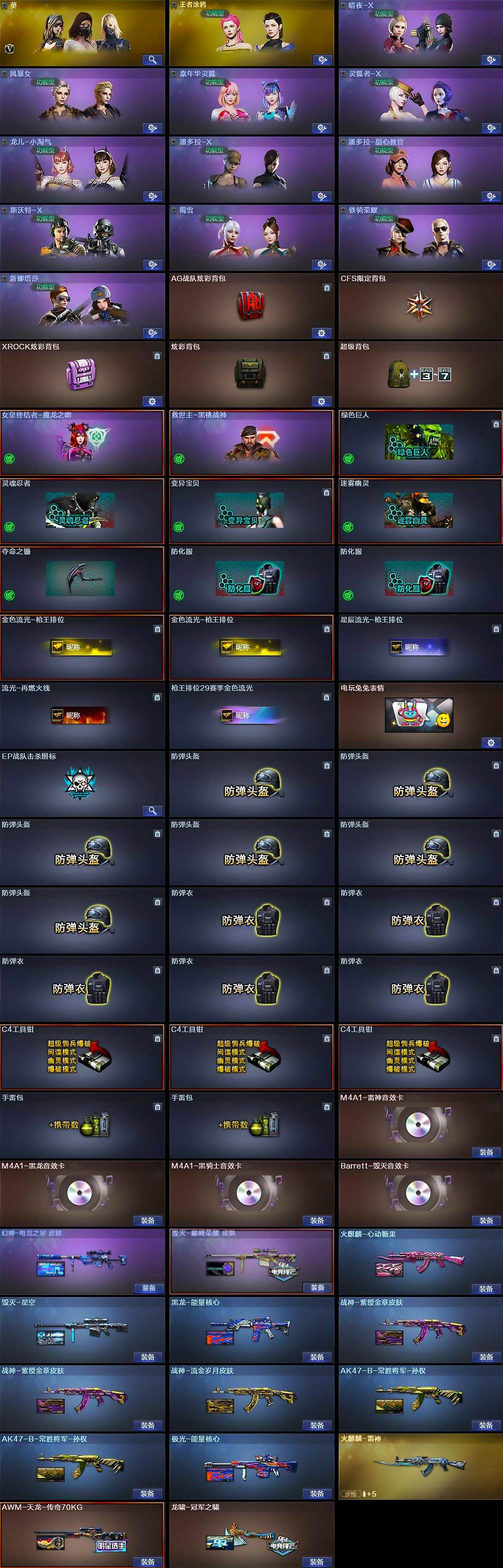 【道具】:AG战队炫彩背包,CFS限定背包,XROCK炫彩背包,炫彩背包,超级背包,女皇终结者-魔龙之吻,救世主-黑桃战神,绿色巨人,灵魂忍者,变异宝贝,迷雾幽灵,夺命之镰,防化服*2,金色流光-枪王排位*2,星辰流光-枪王排位,流光-再燃火线,枪王排位29赛季金色流光,电玩兔兔表情,EP战队击杀图标,防弹头盔*6,防弹衣*5,C4工具钳*3,手