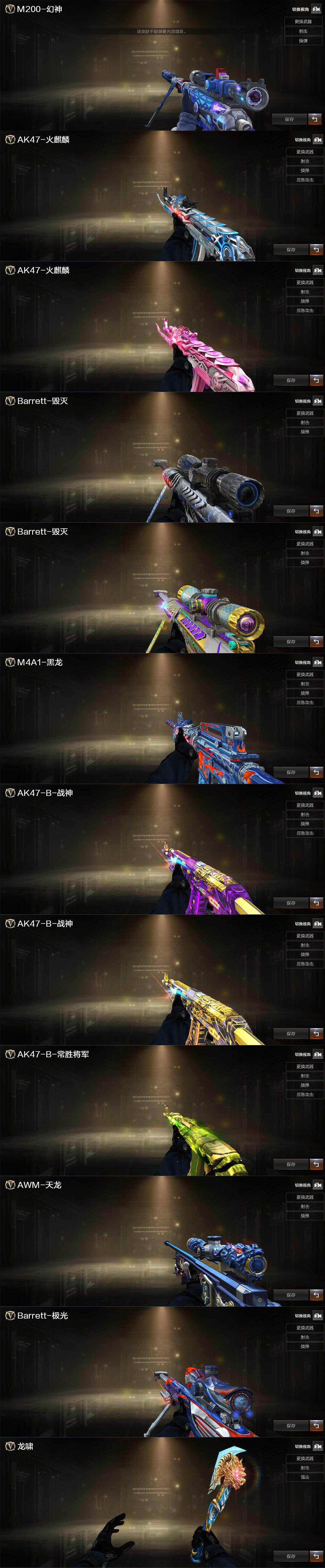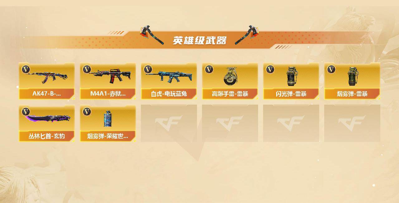 【英雄级武器】:AK47-火麒麟*2,M4A1-黑龙,M4A1-雷神,M4A1-黑骑士*2,AK47-黑武士*2,AK12-天启,AK47-黑鲨,M4A1-龙血*3,M4A1-青龙,无影-神兵利器,QBZ03-金色蔷薇,AK47-B-战神,白虎-电玩蓝兔,Barrett-毁灭*3,Barrett-极光,AWM-裁决,M200-幻神,RPK-盘龙,汤姆逊-烈龙*6,沙鹰-修罗,沙鹰-天神*2,柯尔特-竞技荣光,USP-神工天巧,屠龙*5,龙啸*3,擎天,麒麟刺*2,擎天-竞技荣光,斩神刀-雷暴,丛林匕首-玄豹,高爆手雷-雷暴,高爆手雷-竞技荣光*3,闪光弹-雷暴,闪光弹-竞技荣光*3,烟雾弹-雷暴,烟雾弹-竞技荣光*3,烟雾弹-荣耀世冠EP,M4A1-赤狱骑士