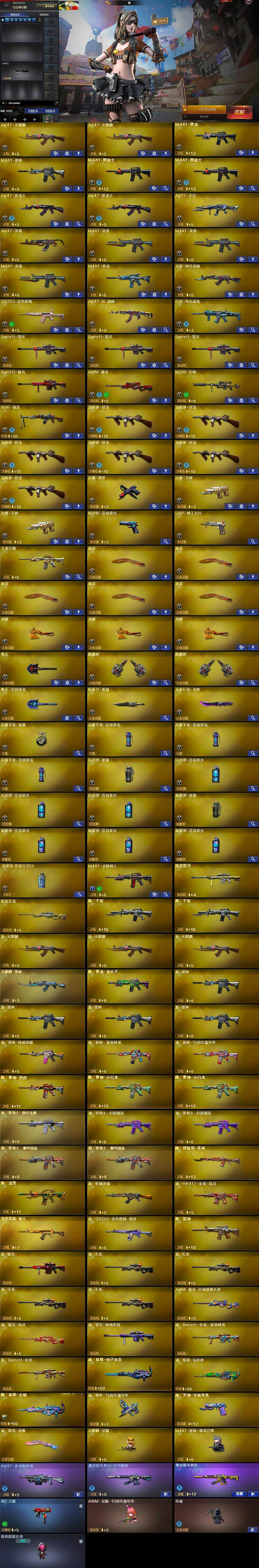 【热门武器】:QBZ03-金色蔷薇,M4A1-青龙,M200-幻神,死亡之眼,白虎-电玩蓝兔,M4A1-黑骑士*2,汤姆逊-烈龙*6,RPK-盘龙,羊驼玩偶,沙鹰-修罗