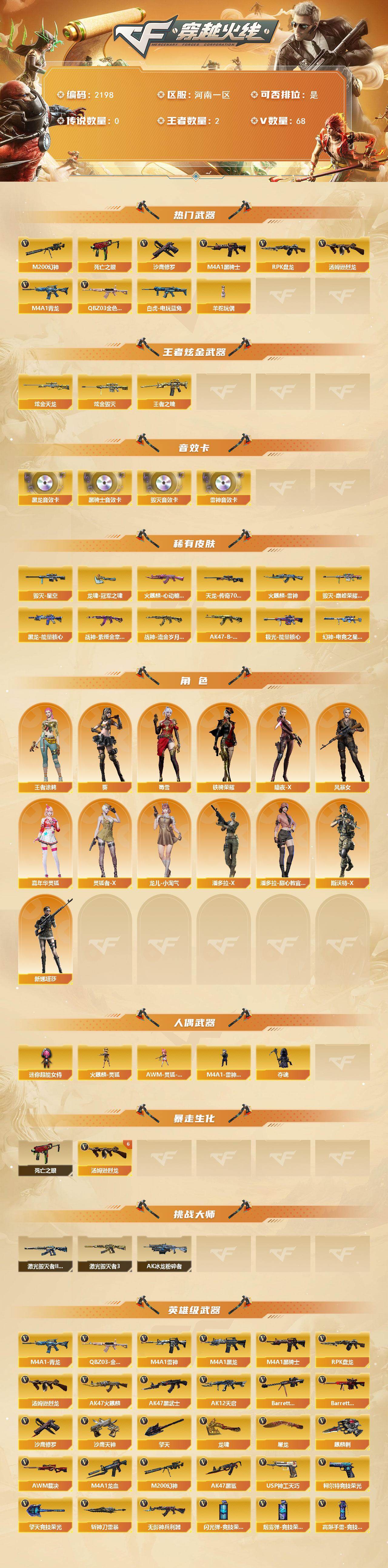 - [16540761]重庆一区-59V-4王者-1炫金 【热门武器】:QBZ03-金色蔷薇,M200-竞技荣光,牛牛-AK47,M4A1-黑骑士,USP-雷暴,沙鹰-修罗*2 【王者炫金武器】:炫金天龙 【音效卡】:AN94-超新星-热带奇洋音效卡,M4A1-黑骑士音效卡,Scar Light-白虎音效卡 【稀有皮肤】:火麒麟-盘古,火麒麟-心动糖果,黑骑士-伏羲,炼狱-星空,毁灭-黑大圣皮肤,毁灭-风暴,天神-暗月 【角色】:王者零-华冠丽服,电竞教官-云悠悠,战地猎狐,蜀雪 【人偶武器】:AWM-灵狐-15周年嘉年华,COP-旗袍,牛牛-AK47,迷你超能女侍,迷你牛牛,生化手雷-机甲核心,闪光弹-貂蝉,高爆手雷-大乔 【暴走生化】:超级对讲机 【挑战大师】:神圣爆裂者-末日III,KAC-圣炎切割者III,激光毁灭者III,激光毁灭者III-白马银枪,冰龙粉碎者-白马银枪 【英雄级武器】:M200-竞技荣光,柯尔特-竞技荣光*3,擎天-竞技荣光*2,高爆手雷-竞技荣光*7,烟雾弹-竞技荣光*7,闪光弹-竞技荣光*7,USP-雷暴,M4A1-武圣,Glock18-武圣,烈火-动感闪耀,天神-动感闪耀,屠龙-动感闪耀,手雷-动感闪耀,QBZ03-金色蔷薇,无影-神兵利器,M4A1-雷神*2,M4A1-黑骑士,AK47-火麒麟,Barrett-毁灭,AWM-裁决,黑武士-锦绣游龙,超新星-热带奇洋,死神-雪域霜狐,AK-47-猩红传说,AK47-B-常胜将军,AWM-昌龙,M4A1-赤狱骑士,沙鹰-修罗*2,擎天-云海游龙,龙啸-热带奇洋 【特殊枪械】:1黑骑士