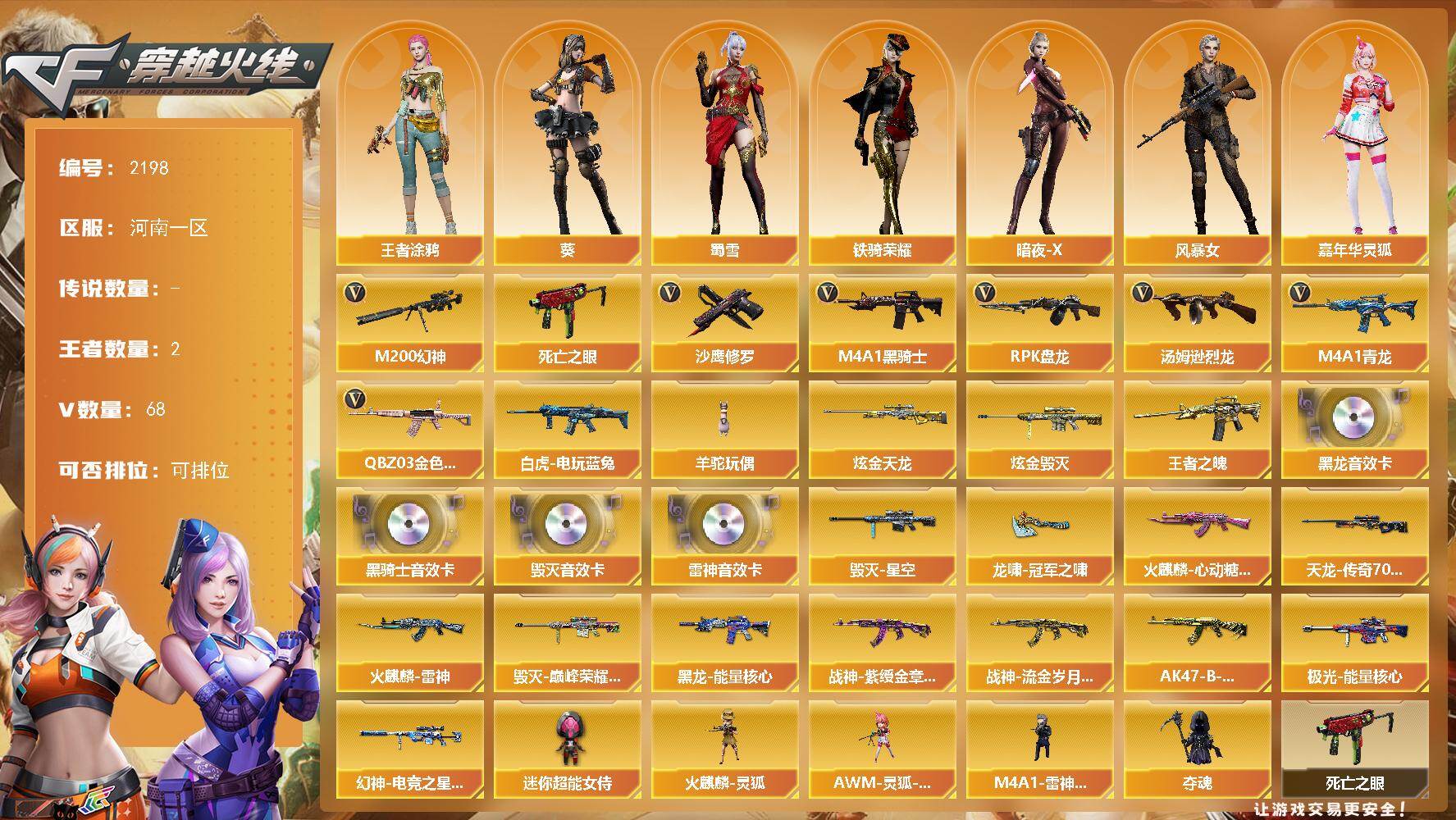 [17044259]河南一区-68V-2王者武器数-2炫金武器数 【热门武器】:QBZ03-金色蔷薇,M4A1-青龙,M200-幻神,死亡之眼,白虎-电玩蓝兔,M4A1-黑骑士*2,汤姆逊-烈龙*6,RPK-盘龙,羊驼玩偶,沙鹰-修罗 【王者炫金武器】:王者之魄,炫金毁灭,炫金天龙 【音效卡】:M4A1-雷神音效卡,M4A1-黑龙音效卡,M4A1-黑骑士音效卡,Barrett-毁灭音效卡 【皮肤】:幻神-电竞之星 皮肤,火麒麟-雷神,火麒麟-心动糖果,毁灭-星空,毁灭-巅峰荣耀 皮肤,黑龙-能量核心,战神-紫绶金章皮肤*2,战神-流金岁月皮肤,AK47-B-常胜将军-孙权*2,AWM-天龙-传奇70KG,极光-能量核心,龙啸-冠军之啸 【角色】:葵,王者涂鸦,暗夜-X,风暴女,嘉年华灵狐,灵狐者-X,龙儿-小淘气,潘多拉-X,潘多拉-甜心教官,斯沃特-X,蜀雪,铁骑荣耀,新娜塔莎 【人偶武器】:火麒麟-灵狐,M4A1-雷神-精英刀锋,AWM-灵狐-15周年嘉年华,夺魂,迷你超能女侍 【暴走生化】:死亡之眼 【挑战大师】:AK47-冰龙粉碎者,激光毁灭者III-白马银枪,激光毁灭者III 【英雄级武器】:AK47-火麒麟*2,M4A1-黑龙,M4A1-雷神,M4A1-黑骑士*2,AK47-黑武士*2,AK12-天启,AK47-黑鲨,M4A1-龙血*3,M4A1-青龙,无影-神兵利器,QBZ03-金色蔷薇,AK47-B-战神,白虎-电玩蓝兔,Barrett-毁灭*3,Barrett-极光,AWM-裁决,M200-幻神,RPK-盘龙,汤姆逊-烈龙*6,沙鹰-修罗,沙鹰-天神*2,柯尔特-竞技荣光,USP-神工天巧,屠龙*5,龙啸*3,擎天,麒麟刺*2,擎天-竞技荣光,斩神刀-雷暴,丛林匕首-玄豹,高爆手雷-雷暴,高爆手雷-竞技荣光*3,闪光弹-雷暴,闪光弹-竞技荣光*3,烟雾弹-雷暴,烟雾弹-竞技荣光*3,烟雾弹-荣耀世冠EP,M4A1-赤狱骑士 【道具】:AG战队炫彩背包,CFS限定背包,XROCK炫彩背包,炫彩背包,超级背包,女皇终结者-魔龙之吻,救世主-黑桃战神,绿色巨人,灵魂忍者,变异宝贝,迷雾幽灵,夺命之镰,防化服*2,金色流光-枪王排位*2,星辰流光-枪王排位,流光-再燃火线,枪王排位29赛季金色流光,电玩兔兔表情,EP战队击杀图标,防弹头盔*6,防弹衣*5,C4工具钳*3,手