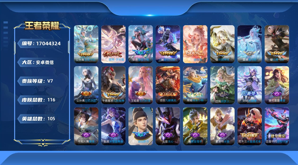 [17044324]安卓WX-V7-最强王者段位-105英雄-116皮肤-11传说-36史诗