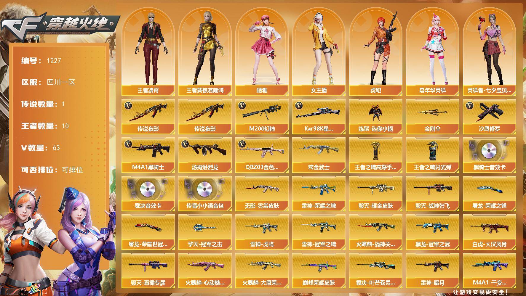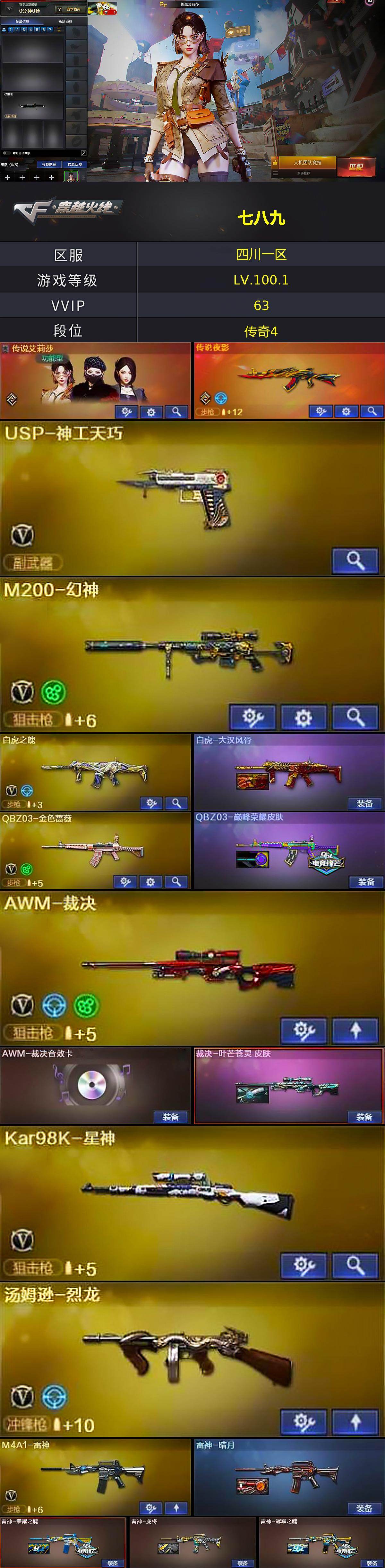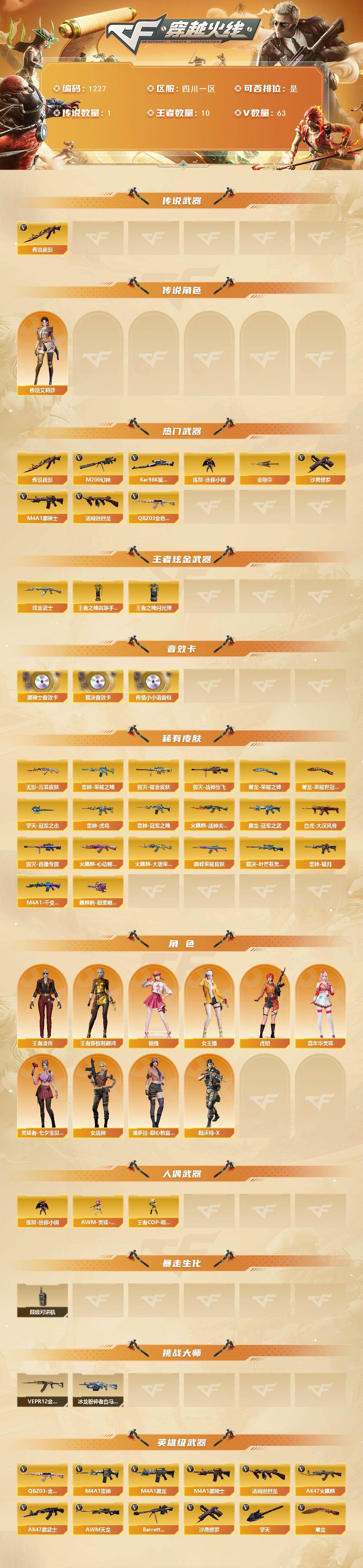 [17045006]四川一区-67V-10王者武器数-1炫金武器数 【传说武器】:传说夜影 【传说角色】:传说艾莉莎 【热门武器】:传说夜影,QBZ03-金色蔷薇,M200-幻神,Kar98K-星神,炼狱-迷你小钢,M4A1-黑骑士,汤姆逊-烈龙,沙鹰-修罗*6,金刚伞*2 【王者炫金武器】:炫金武士,王者之魄高爆手雷*4,王者之魄闪光弹 【音效卡】:M4A1-黑骑士音效卡,AWM-裁决音效卡,传情小小语音包 【皮肤】:白虎-大汉风骨,QBZ03-巅峰荣耀皮肤,裁决-叶芒苍灵 皮肤,雷神-暗月,雷神-荣耀之魄,雷神-虎将,雷神-冠军之魄,火麒麟-战神关羽,火麒麟-大唐荣光,火麒麟-心动糖果,毁灭耀金皮肤,毁灭-战神张飞,毁灭-直播专属,M4A1-千变-孔明皮肤,黑龙-冠军之武,无影-霓裳皮肤,屠龙-荣耀之锋*2,屠龙-荣耀世冠AG,擎天-冠军之击,麒麟刺-甜蜜糖果 皮肤 【角色】:晴雅,王者葵-惊若翩鸿,王者凌霄,虎妞,嘉年华灵狐,灵狐者-七夕宝贝,女战神,女主播,潘多拉-甜心教官,斯沃特-X 【人偶武器】:炼狱-迷你小钢,王者COP-精英刀锋,AWM-灵狐-15周年嘉年华 【暴走生化】:超级对讲机 【挑战大师】:冰龙粉碎者-白马银枪,VEPR-12-金魔 【英雄级武器】:M4A1-千变,AK47-火麒麟*2,M4A1-黑龙,M4A1-雷神,M4A1-黑骑士,AK47-黑武士,AK47-机械迷城,QBZ03-天罚,M4A1-神工天巧,无影-神兵利器,QBZ03-金色蔷薇,王者之势-觉醒版,白虎之魄-觉醒版,AWM-天龙,Barrett-毁灭*3,AWM-裁决,M200-幻神,Kar98K-星神,汤姆逊-烈龙,AA-12-雷霆,沙鹰-修罗*6,USP-神工天巧,王者之魂-觉醒版,屠龙*3,擎天,麒麟刺*2,幻灵之锋,唐刀-神工天巧*2,王者之锋-觉醒版,高爆手雷-幻灵,高爆手雷-神工天巧*5,闪光弹-幻灵,闪光弹-神工天巧*8,烟雾弹-竞技荣光,烟雾弹-神工天巧*5,M4A1-赤狱骑士 【道具】:云山科技背包,炫彩背包,超级背包,绿色巨人,灵魂忍者,迷雾幽灵,夺命之镰,防化服*2,金色流光-枪王排位*2,防弹头盔*5,防弹衣*5,C4工具钳*5,手雷包*5 【特殊枪械】:1黑骑士,1烈龙