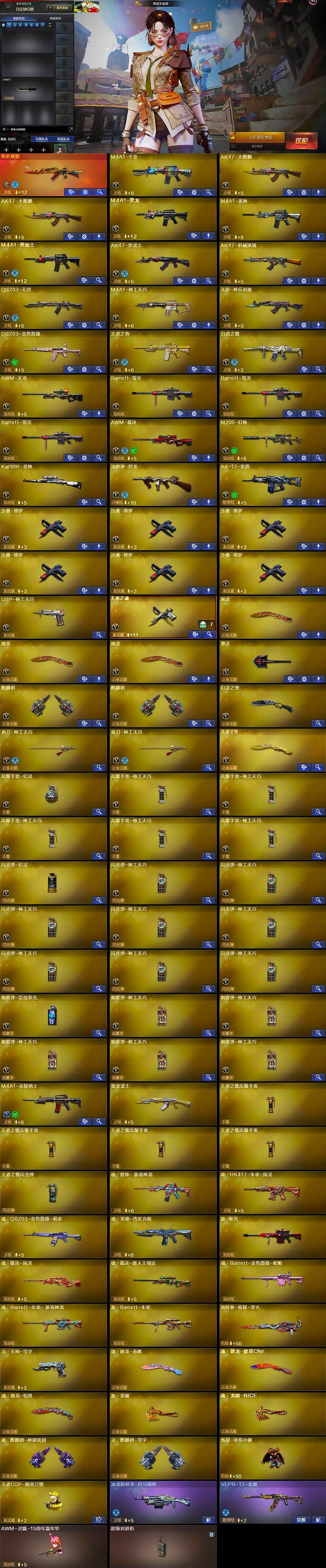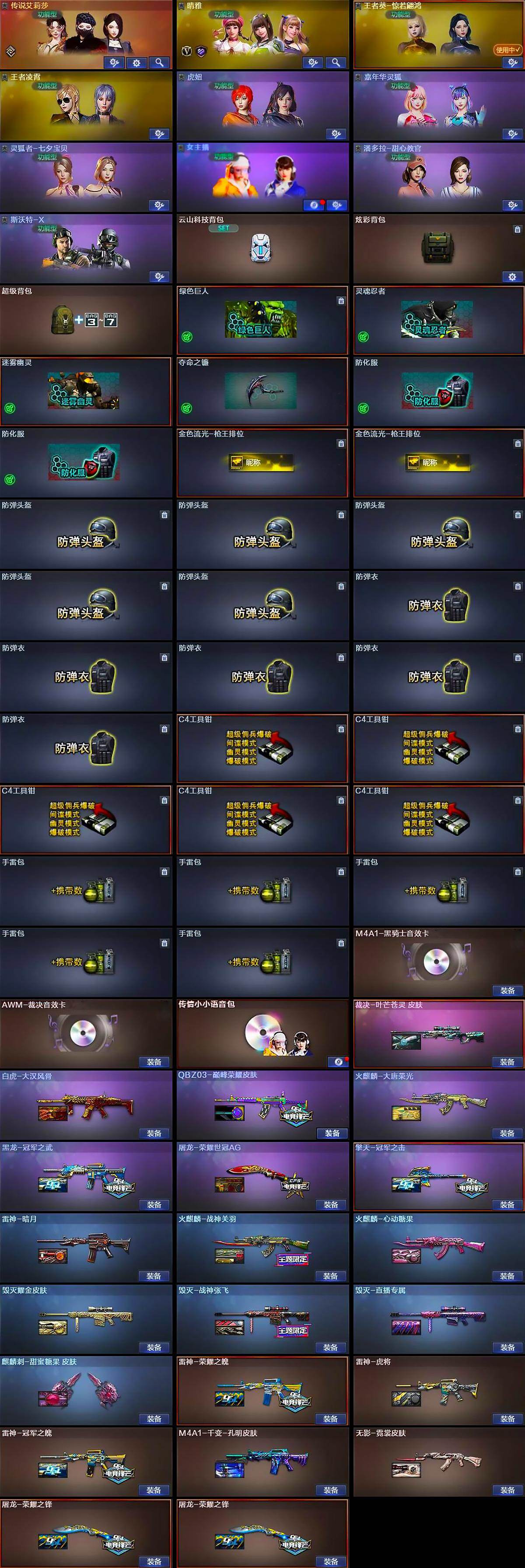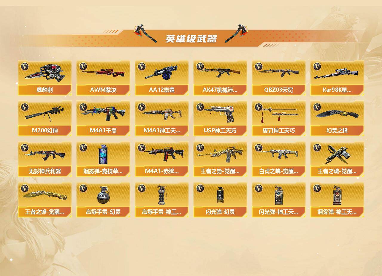 【英雄级武器】:M4A1-千变,AK47-火麒麟*2,M4A1-黑龙,M4A1-雷神,M4A1-黑骑士,AK47-黑武士,AK47-机械迷城,QBZ03-天罚,M4A1-神工天巧,无影-神兵利器,QBZ03-金色蔷薇,王者之势-觉醒版,白虎之魄-觉醒版,AWM-天龙,Barrett-毁灭*3,AWM-裁决,M200-幻神,Kar98K-星神,汤姆逊-烈龙,AA-12-雷霆,沙鹰-修罗*6,USP-神工天巧,王者之魂-觉醒版,屠龙*3,擎天,麒麟刺*2,幻灵之锋,唐刀-神工天巧*2,王者之锋-觉醒版,高爆手雷-幻灵,高爆手雷-神工天巧*5,闪光弹-幻灵,闪光弹-神工天巧*8,烟雾弹-竞技荣光,烟雾弹-神工天巧*5,M4A1-赤狱骑士