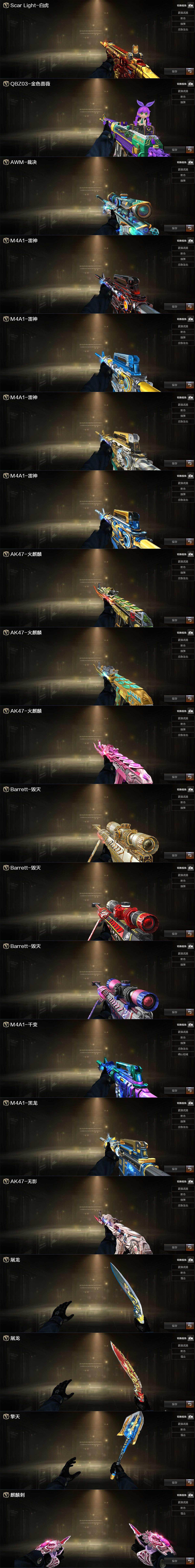 【皮肤】:白虎-大汉风骨,QBZ03-巅峰荣耀皮肤,裁决-叶芒苍灵 皮肤,雷神-暗月,雷神-荣耀之魄,雷神-虎将,雷神-冠军之魄,火麒麟-战神关羽,火麒麟-大唐荣光,火麒麟-心动糖果,毁灭耀金皮肤,毁灭-战神张飞,毁灭-直播专属,M4A1-千变-孔明皮肤,黑龙-冠军之武,无影-霓裳皮肤,屠龙-荣耀之锋*2,屠龙-荣耀世冠AG,擎天-冠军之击,麒麟刺-甜蜜糖果 皮肤