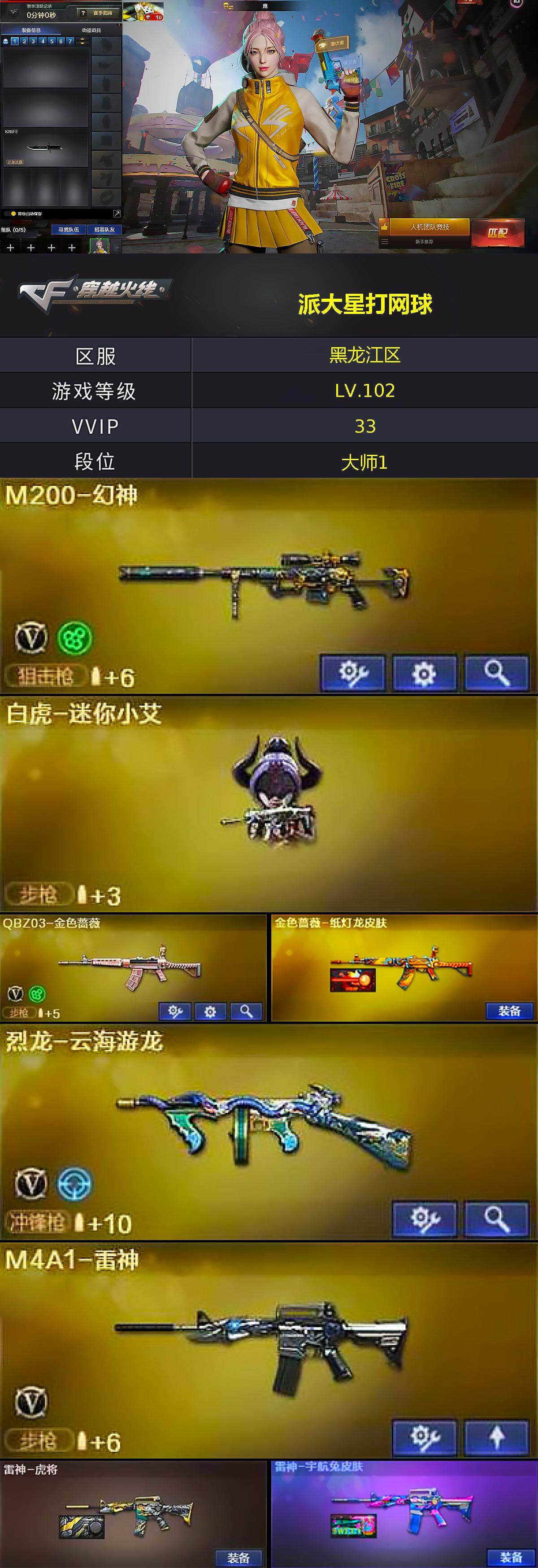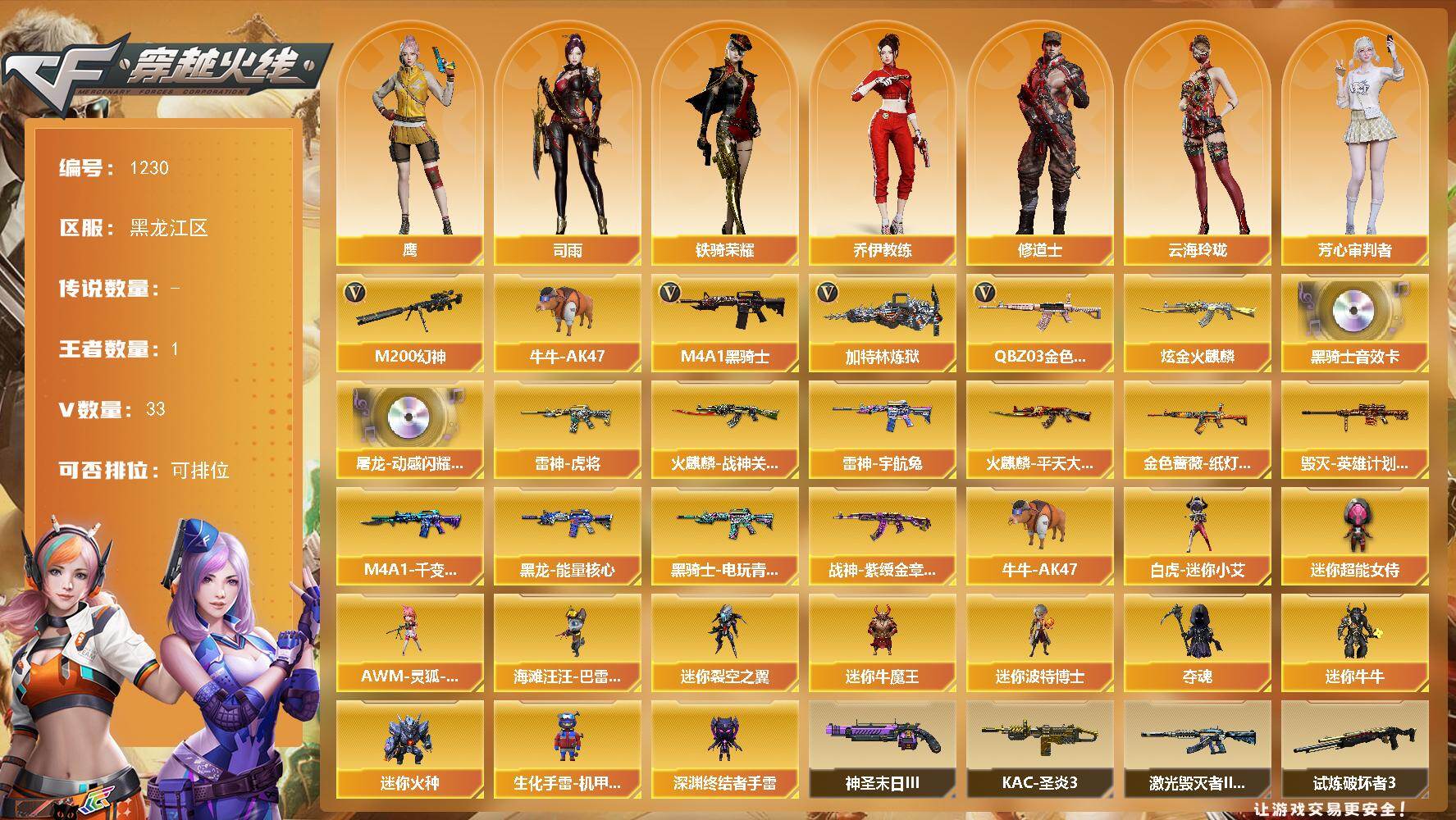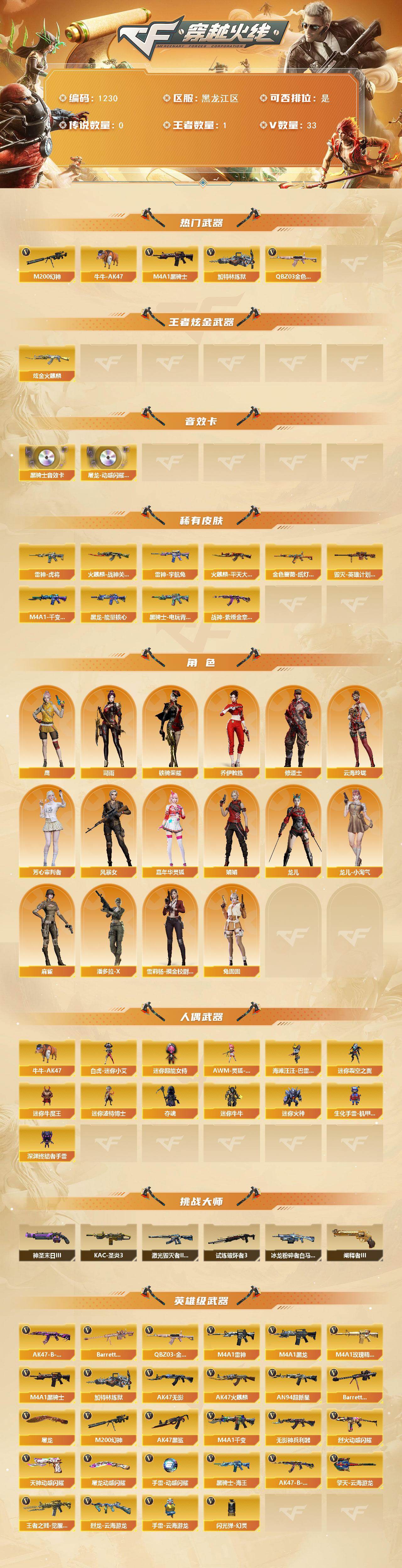 [17045518]黑龙江区-34V-1王者武器数-1炫金武器数 【热门武器】:QBZ03-金色蔷薇,M200-幻神,牛牛-AK47,M4A1-黑骑士*2,加特林-炼狱 【王者炫金武器】:炫金火麒麟 【音效卡】:屠龙-动感闪耀 音效卡,M4A1-黑骑士音效卡 【皮肤】:金色蔷薇-纸灯龙皮肤,雷神-虎将,雷神-宇航兔皮肤,火麒麟-战神关羽,火麒麟-平天大圣,毁灭-英雄计划 皮肤,M4A1-千变-孔明皮肤,黑龙-能量核心,黑骑士-电玩青兔皮肤,战神-紫绶金章皮肤 【角色】:鹰,司雨,乔伊教练,修道士,云海玲珑,芳心审判者,风暴女,嘉年华灵狐,娟娟,龙儿,龙儿-小淘气,麻雀,潘多拉-X,铁骑荣耀,兔囡囡,雪莉杨-摸金校尉 【人偶武器】:白虎-迷你小艾,AWM-灵狐-15周年嘉年华,海滩汪汪-巴雷特,牛牛-AK47,迷你裂空之翼*4,迷你牛魔王,迷你波特博士*6,夺魂,迷你牛牛*2,迷你火种*3,生化手雷-机甲核心,深渊终结者手雷,迷你超能女侍 【挑战大师】:冰龙粉碎者-白马银枪,激光毁灭者III-白马银枪*2,试炼破坏者III,KAC-圣炎切割者III,神圣爆裂者-末日III,阐释者III 【英雄级武器】:M4A1-千变,AK47-火麒麟,M4A1-黑龙,M4A1-雷神,M4A1-黑骑士*2,AK47-无影,AN94-超新星,AK47-黑鲨,无影-神兵利器,M4A1-玫瑰精灵,QBZ03-金色蔷薇,烈火-动感闪耀,王者之戮-觉醒版,AK47-B-战神*3,黑骑士-海王,AK47-B-常胜将军,Barrett-毁灭,M200-幻神,Barrett-金色蔷薇,加特林-炼狱,烈龙-云海游龙,天神-动感闪耀,屠龙,屠龙-动感闪耀,擎天-云海游龙,手雷-动感闪耀,手雷-云海游龙,闪光弹-幻灵 【道具】:XROCK炫彩背包,云海游龙炫彩背包,全能枪王背包,老虎背包,超级背包,哔哩哔哩名片,女皇终结者-魔龙之吻,绿色巨人,灵魂忍者,迷雾幽灵,夺命之镰*2,防化服*2,金色流光-枪王排位*2,星辰流光-枪王排位,电玩兔兔表情,动感闪耀表情,云海游龙表情,EP战队名片,防弹头盔*3,防弹衣*3,C4工具钳*4,手雷包*5 【特殊枪械】:2黑骑士,1炼狱