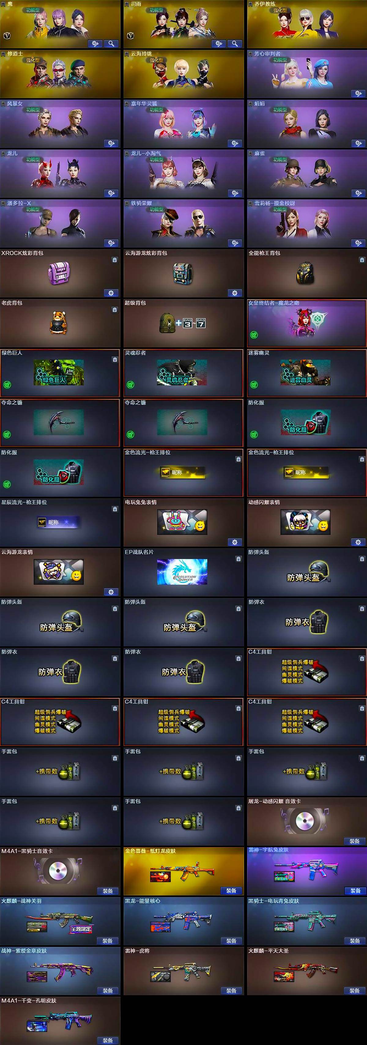 【道具】:XROCK炫彩背包,云海游龙炫彩背包,全能枪王背包,老虎背包,超级背包,哔哩哔哩名片,女皇终结者-魔龙之吻,绿色巨人,灵魂忍者,迷雾幽灵,夺命之镰*2,防化服*2,金色流光-枪王排位*2,星辰流光-枪王排位,电玩兔兔表情,动感闪耀表情,云海游龙表情,EP战队名片,防弹头盔*3,防弹衣*3,C4工具钳*4,手雷包*5