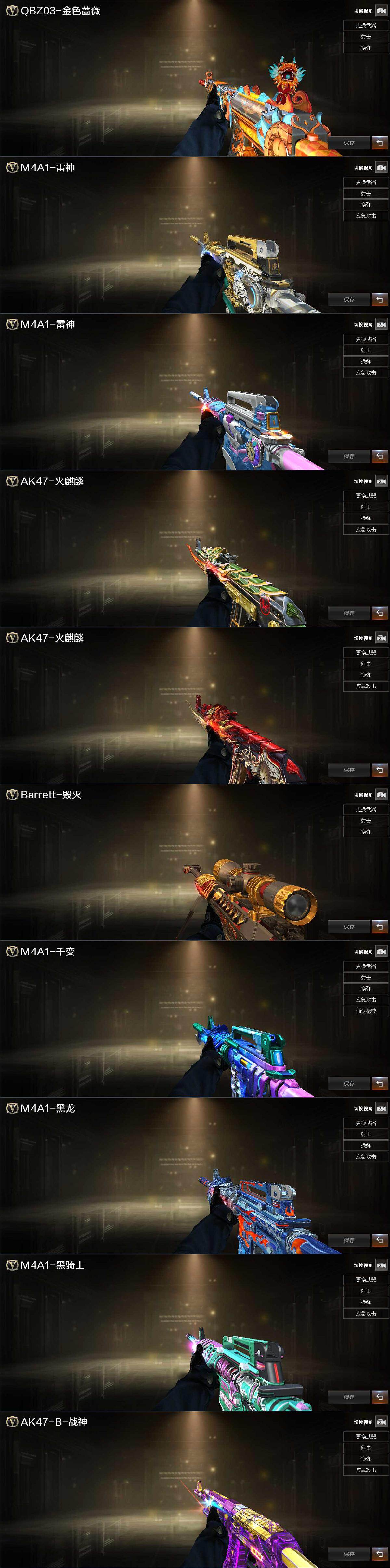 【英雄级武器】:M4A1-千变,AK47-火麒麟,M4A1-黑龙,M4A1-雷神,M4A1-黑骑士*2,AK47-无影,AN94-超新星,AK47-黑鲨,无影-神兵利器,M4A1-玫瑰精灵,QBZ03-金色蔷薇,烈火-动感闪耀,王者之戮-觉醒版,AK47-B-战神*3,黑骑士-海王,AK47-B-常胜将军,Barrett-毁灭,M200-幻神,Barrett-金色蔷薇,加特林-炼狱,烈龙-云海游龙,天神-动感闪耀,屠龙,屠龙-动感闪耀,擎天-云海游龙,手雷-动感闪耀,手雷-云海游龙,闪光弹-幻灵
