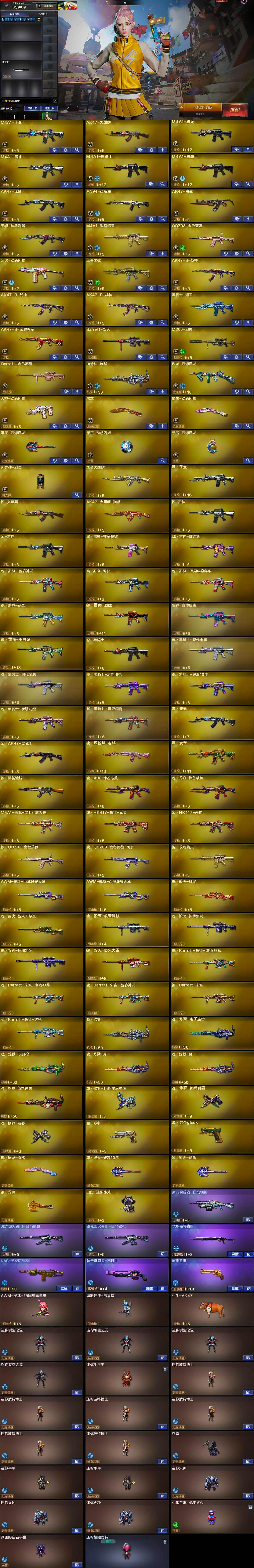 【人偶武器】:白虎-迷你小艾,AWM-灵狐-15周年嘉年华,海滩汪汪-巴雷特,牛牛-AK47,迷你裂空之翼*4,迷你牛魔王,迷你波特博士*6,夺魂,迷你牛牛*2,迷你火种*3,生化手雷-机甲核心,深渊终结者手雷,迷你超能女侍