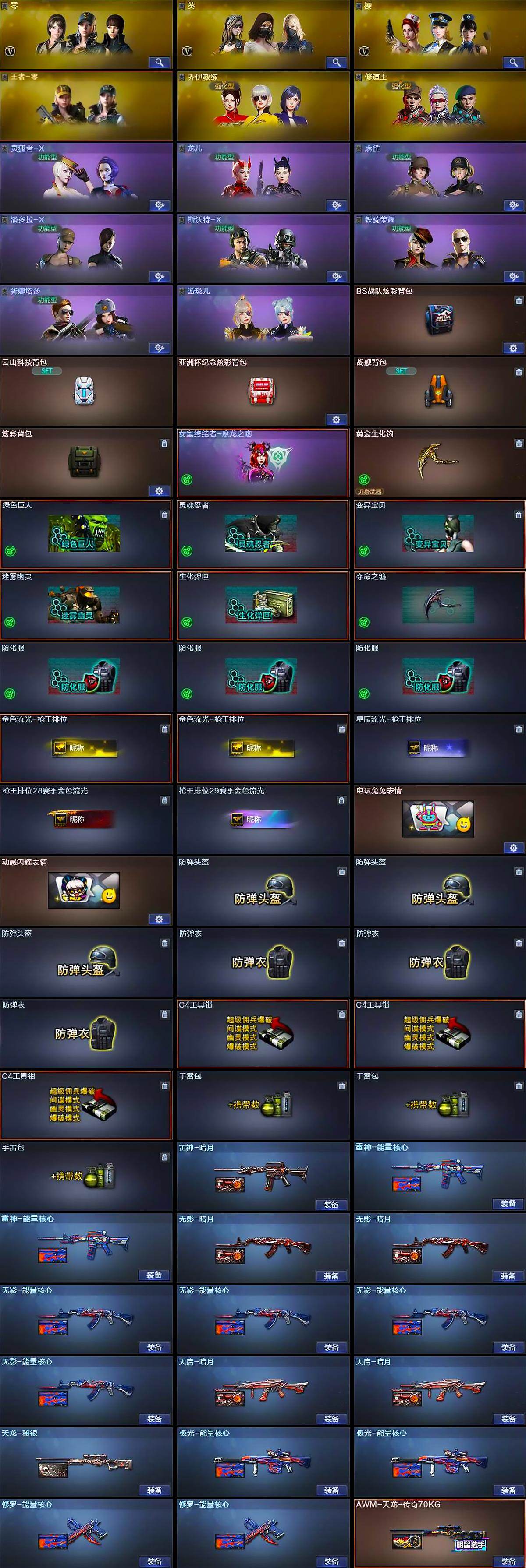 【道具】:BS战队炫彩背包,云山科技背包,亚洲杯纪念炫彩背包,战舰背包,炫彩背包,女皇终结者-魔龙之吻,黄金生化钩,绿色巨人,灵魂忍者,变异宝贝,迷雾幽灵,生化弹匣,夺命之镰,防化服*3,金色流光-枪王排位*2,星辰流光-枪王排位,枪王排位28赛季金色流光,枪王排位29赛季金色流光,电玩兔兔表情,动感闪耀表情,防弹头盔*3,防弹衣*3,C4工具钳*3,手雷包*3