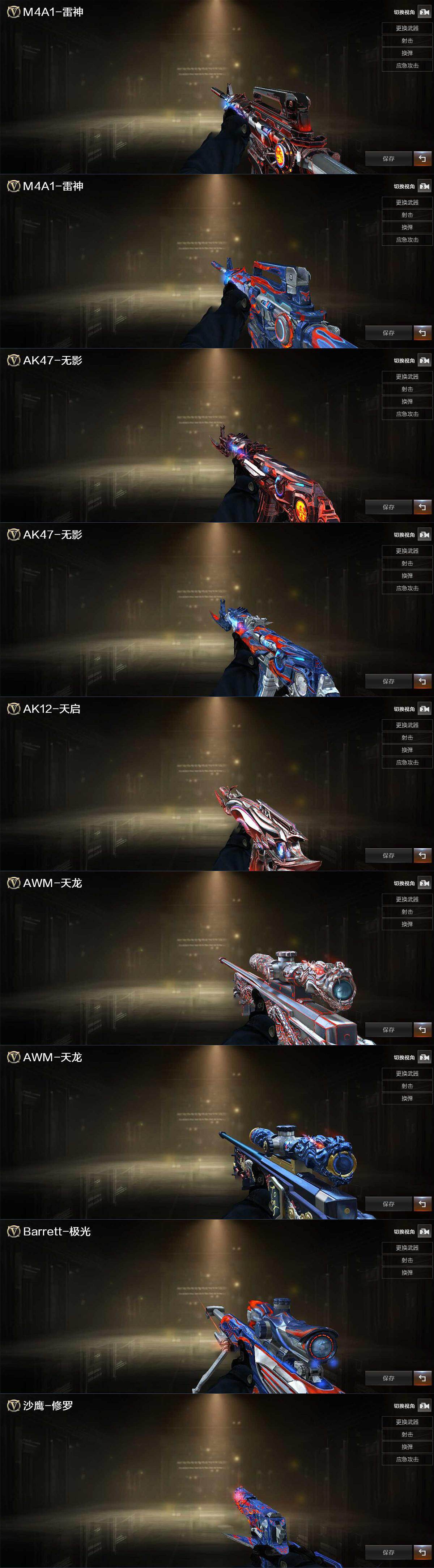 【英雄级武器】:AK47-火麒麟,M4A1-雷神,M4A1-武圣,QBZ03-金色蔷薇,AWM-天龙,加特林-炼狱,AA-12-雷霆,沙鹰-修罗*6,Glock18-武圣,屠龙*3,龙啸,擎天*3,M4A1-赤狱骑士
