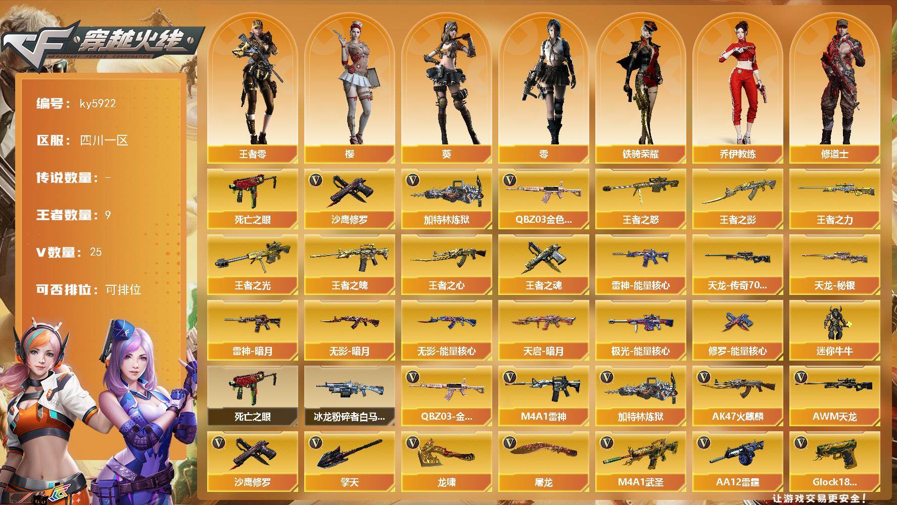 [17045696]四川一区-25V-9王者武器数-0炫金武器数 【热门武器】:QBZ03-金色蔷薇,死亡之眼,加特林-炼狱,沙鹰-修罗*6 【王者炫金武器】:王者之影*3,王者之魄,王者之心,王者之光,王者之怒,王者之力,王者之魂 【皮肤】:雷神-暗月,雷神-能量核心*2,无影-暗月*2,无影-能量核心*4,天启-暗月*2,天龙-秘银,AWM-天龙-传奇70KG,极光-能量核心*2,修罗-能量核心*2 【角色】:零,葵,樱,王者-零,乔伊教练,修道士,灵狐者-X,龙儿,麻雀,潘多拉-X,斯沃特-X,铁骑荣耀,新娜塔莎,游珑儿 【人偶武器】:迷你牛牛*2 【暴走生化】:死亡之眼 【挑战大师】:冰龙粉碎者-白马银枪 【英雄级武器】:AK47-火麒麟,M4A1-雷神,M4A1-武圣,QBZ03-金色蔷薇,AWM-天龙,加特林-炼狱,AA-12-雷霆,沙鹰-修罗*6,Glock18-武圣,屠龙*3,龙啸,擎天*3,M4A1-赤狱骑士 【道具】:BS战队炫彩背包,云山科技背包,亚洲杯纪念炫彩背包,战舰背包,炫彩背包,女皇终结者-魔龙之吻,黄金生化钩,绿色巨人,灵魂忍者,变异宝贝,迷雾幽灵,生化弹匣,夺命之镰,防化服*3,金色流光-枪王排位*2,星辰流光-枪王排位,枪王排位28赛季金色流光,枪王排位29赛季金色流光,电玩兔兔表情,动感闪耀表情,防弹头盔*3,防弹衣*3,C4工具钳*3,手雷包*3 【特殊枪械】:1炼狱