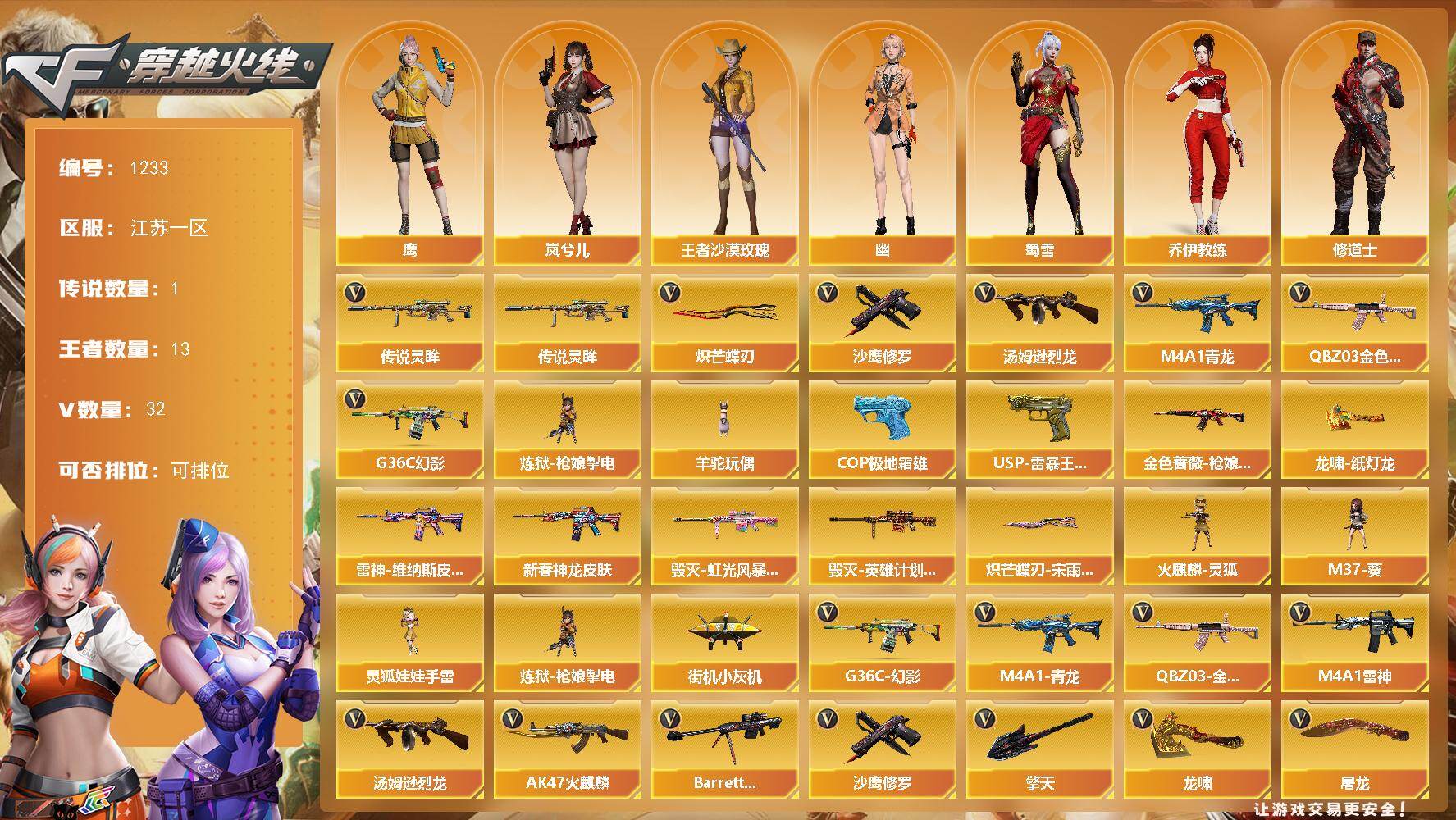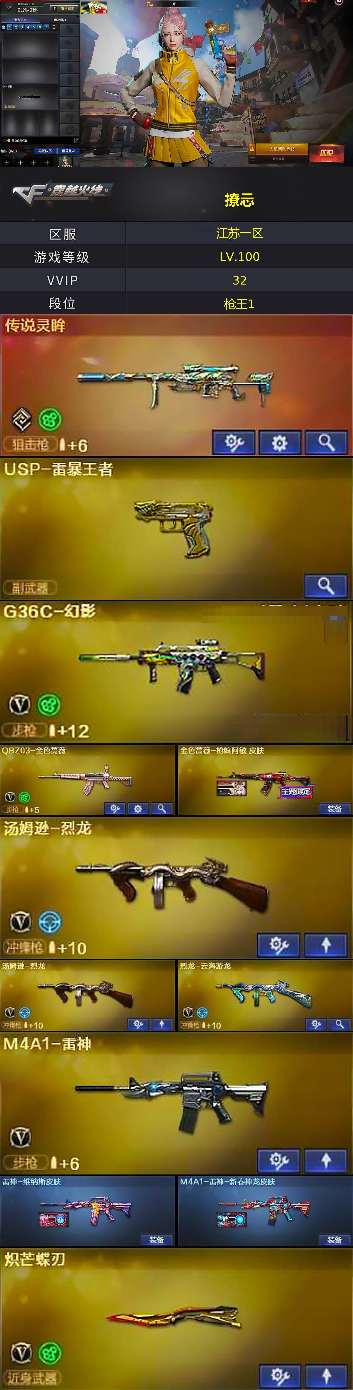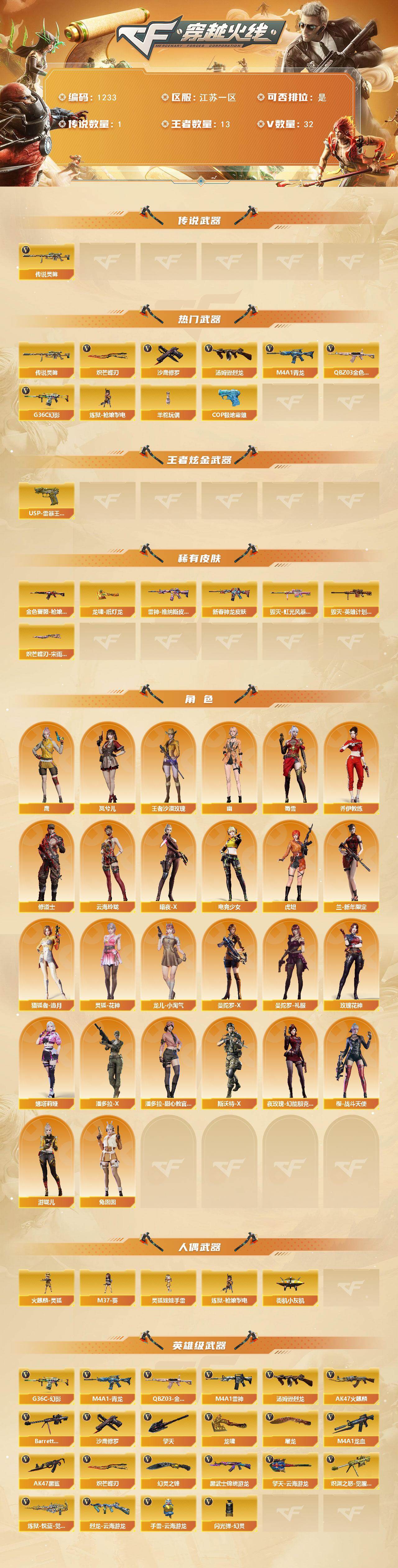 [17045975]江苏一区-35V-13王者武器数-0炫金武器数 【传说武器】:传说灵眸 【热门武器】:传说灵眸,G36C-幻影,QBZ03-金色蔷薇,M4A1-青龙,汤姆逊-烈龙*2,炼狱-枪娘掣电,羊驼玩偶,沙鹰-修罗*6,炽芒蝶刃,COP 357-极地霜雄 【王者炫金武器】:USP-雷暴王者 【皮肤】:金色蔷薇-枪娘阿敏 皮肤,雷神-维纳斯皮肤,M4A1-雷神-新春神龙皮肤,毁灭-虹光风暴 皮肤,毁灭-英雄计划 皮肤,龙啸-纸灯龙皮肤,炽芒蝶刃-宋雨琦 皮肤 【角色】:鹰,岚兮儿,王者沙漠玫瑰,乔伊教练,修道士,云海玲珑,暗夜-X,电竞少女,虎妞,兰-新年限定,猎狐者-追月,灵狐-花神,龙儿-小淘气,曼陀罗-X,曼陀罗-礼服,玫瑰花神,娜塔莉娅,潘多拉-X,潘多拉-甜心教官,斯沃特-X,蜀雪,兔囡囡,夜玫瑰-幻能朋克,樱-战斗天使,幽,游珑儿 【人偶武器】:火麒麟-灵狐,炼狱-枪娘掣电,街机小灰机,M37-葵,灵狐娃娃手雷 【英雄级武器】:AK47-火麒麟,M4A1-雷神,AK47-黑鲨,M4A1-龙血,M4A1-青龙,G36C-幻影,黑武士-锦绣游龙,QBZ03-金色蔷薇,Barrett-毁灭,炽渊之怒-觉醒版,炼狱-悦蓝-觉醒版,汤姆逊-烈龙*2,烈龙-云海游龙,沙鹰-修罗*6,屠龙*2,龙啸,擎天,幻灵之锋,炽芒蝶刃,擎天-云海游龙,手雷-云海游龙,闪光弹-幻灵 【道具】:云海游龙炫彩背包,亚洲杯纪念炫彩背包,炫彩背包,超级背包,黄金超能特工背包,女皇终结者-魔龙之吻,救世主-黑桃战神,绿色巨人,灵魂忍者,变异宝贝,迷雾幽灵,夺命之镰,防化服*2,金色流光-枪王排位,星辰流光-枪王排位,流光-再燃火线,枪王排位28赛季金色流光,枪王排位29赛季金色流光,云海游龙表情*2,防弹头盔*2,防弹衣*2,C4工具钳*2,手雷包*2 【特殊枪械】:2烈龙