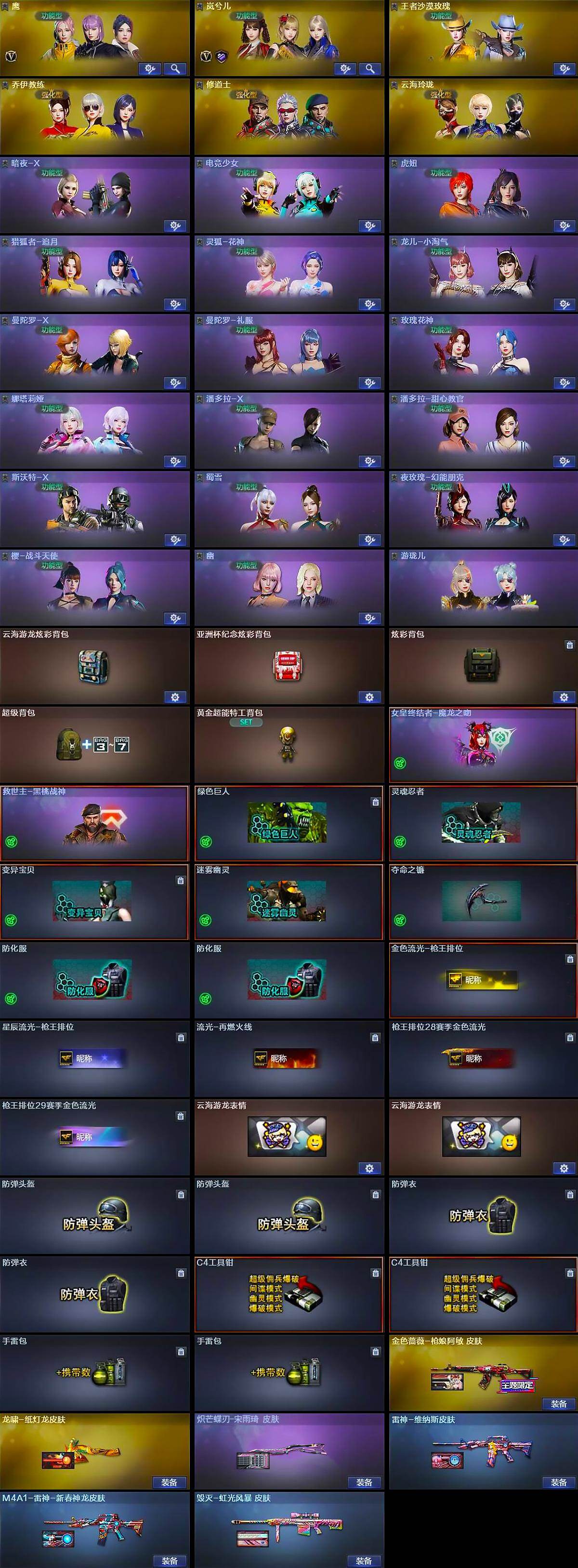【道具】:云海游龙炫彩背包,亚洲杯纪念炫彩背包,炫彩背包,超级背包,黄金超能特工背包,女皇终结者-魔龙之吻,救世主-黑桃战神,绿色巨人,灵魂忍者,变异宝贝,迷雾幽灵,夺命之镰,防化服*2,金色流光-枪王排位,星辰流光-枪王排位,流光-再燃火线,枪王排位28赛季金色流光,枪王排位29赛季金色流光,云海游龙表情*2,防弹头盔*2,防弹衣*2,C4工具钳*2,手雷包*2