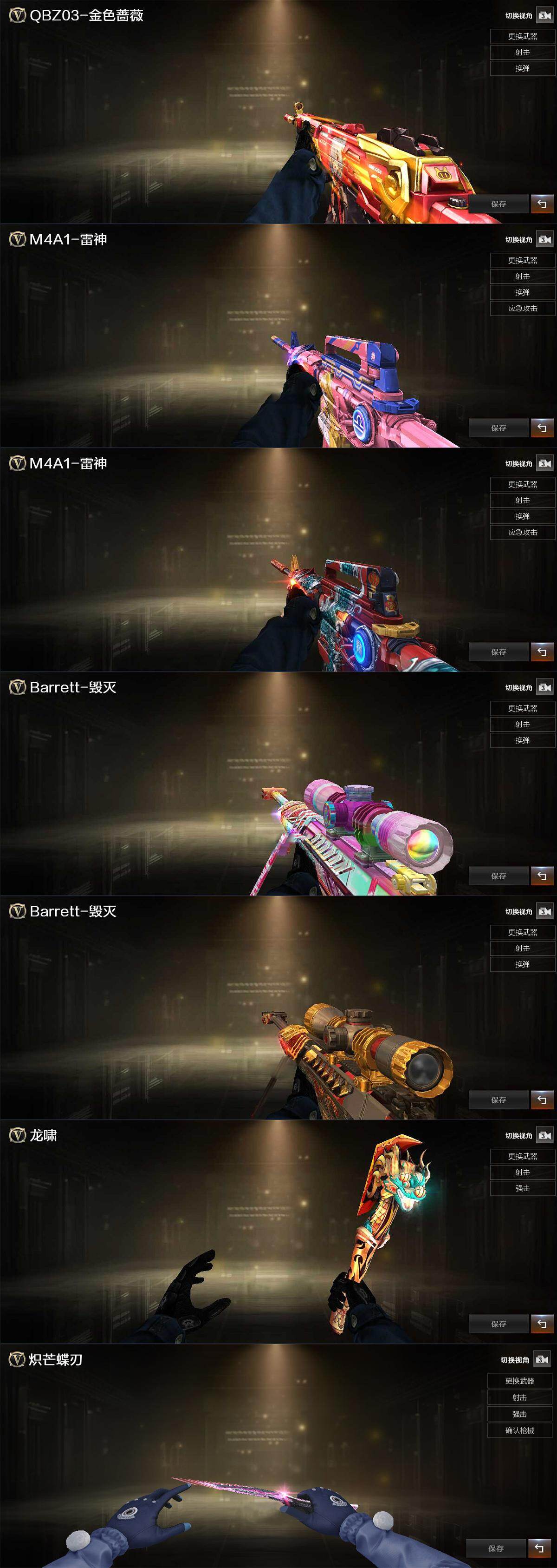 【皮肤】:金色蔷薇-枪娘阿敏 皮肤,雷神-维纳斯皮肤,M4A1-雷神-新春神龙皮肤,毁灭-虹光风暴 皮肤,毁灭-英雄计划 皮肤,龙啸-纸灯龙皮肤,炽芒蝶刃-宋雨琦 皮肤