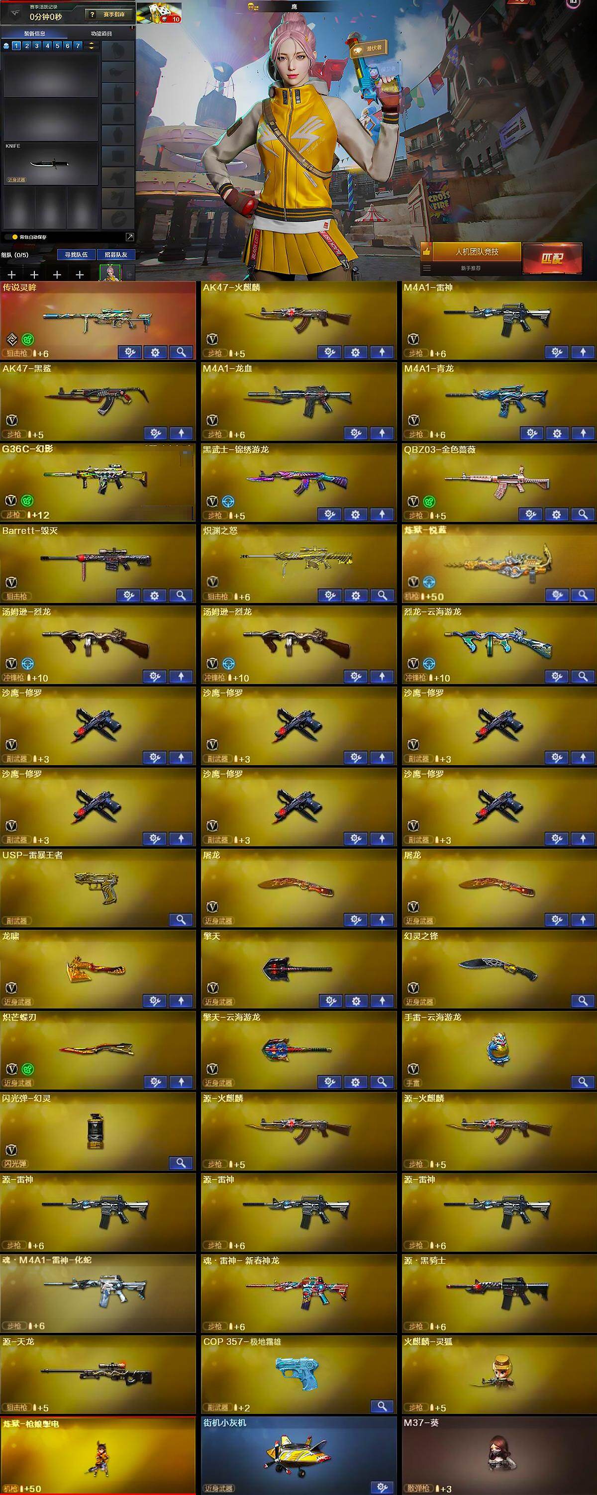 【热门武器】:传说灵眸,G36C-幻影,QBZ03-金色蔷薇,M4A1-青龙,汤姆逊-烈龙*2,炼狱-枪娘掣电,羊驼玩偶,沙鹰-修罗*6,炽芒蝶刃,COP 357-极地霜雄