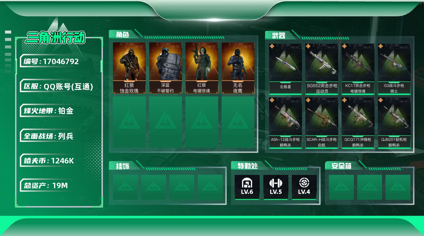 [17046792]19m总资产-1246k哈伏币-60烽火等级-铂金-11战场等级-列兵 【干员外观】:红狼-蚀金玫瑰,无名-夜鹰,深蓝-不破誓约,红狼-电锯惊魂 【近战皮肤】:近战-北极星,近战-黑鹰 【传说外观】:M4A1突击步枪-蚀金玫瑰,M4A1突击步枪-阿米娅,ASh-12战斗步枪-鹅鸭杀,SG552突击步枪-运动员,AK-12突击步枪-夜鹰,AK-12突击步枪-特斯拉线圈,SCAR-H战斗步枪-启航,G3战斗步枪-骑士,CAR-15突击步枪-黑鹰坠落,K437突击步枪-北极星,KC17突击步枪-电锯惊魂,Vector冲锋枪-能天使-午夜邮差,UZI冲锋枪-特斯拉线圈,SMG-45冲锋枪-骑士,SR-3M紧凑突击步枪-特斯拉线圈,勇士冲锋枪-能天使-午夜邮差,QCQ171冲锋枪-北极星,QCQ171冲锋枪-鹅鸭杀,M250通用机枪-骑士之心,QJB201轻机枪-鹅鸭杀,M14射手步枪-电锯惊魂 【史诗外观】:AKM突击步枪-林中猎手,ASh-12战斗步枪-守夜人,ASh-12战斗步枪-无极限,AUG突击步枪-蝮蛇,SG552突击步枪-尖端治疗,SG552突击步枪-深海恐惧,SCAR-H战斗步枪-囚徒,AS Val突击步枪-尖端治疗,AS Val突击步枪-百步穿杨,腾龙突击步枪-猎鳄行动,K437突击步枪-守护者,MP5冲锋枪-深海恐惧,MP5冲锋枪-战术竞备,Vector冲锋枪-阿萨拉文明,Vector冲锋枪-异域战争,SR-3M紧凑突击步枪-战术竞备,勇士冲锋枪-工业狂潮,MP7冲锋枪-守护者,M1014霰弹枪-林中猎手,S12K霰弹枪-曙光,PKM通用机枪-蝮蛇,PKM通用机枪-守夜人,M250通用机枪-囚徒,Mini-14射手步枪-守护者,SVD狙击步枪-阿萨拉工艺,M14射手步枪-黑鹰坠落,SR-25射手步枪-尖端治疗,SR-25射手步枪-聚光灯,SV-98狙击步枪-囚徒,M700狙击步枪-守夜人,AWM狙击步枪-无极限,.357左轮-幸运时刻,复合弓-守护者 【稀有外观】:PKM通用机枪-极地勘察队,AKM突击步枪-战术演练,QBZ95-1突击步枪-公平竞技,K416突击步枪-黑骑士,M16A4突击步枪-远航,M7战斗步枪-捣蛋鬼,SCAR-H战斗步枪-童趣,SCAR-H战斗步枪-远航,SCAR-H战斗步枪-荣耀列队,SCAR-H战斗步枪-黄昏,G3战斗步枪-战