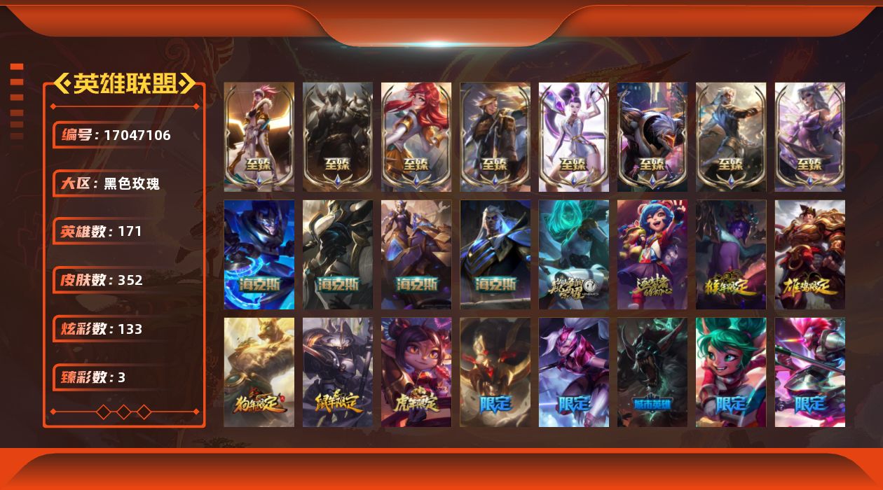[17047106]【店主推荐捡漏号】未定级段位-171英雄-352皮肤-133炫彩-0终极-15神话-34限定-45传说-83史诗
