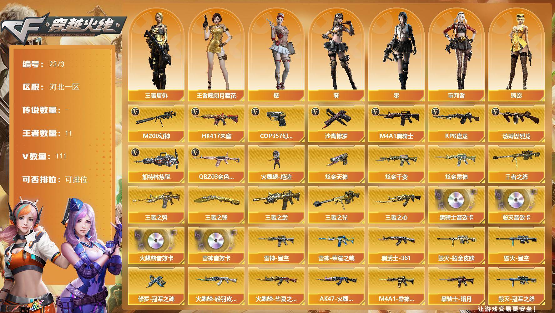 [17048136]河北一区-111V-11王者-5炫金 【热门武器】:QBZ03-金色蔷薇,HK417-朱雀,M200-幻神,M4A1-黑骑士*3,汤姆逊-烈龙*7,RPK-盘龙*9,加特林-炼狱*3,火麒麟-绝迹,COP 357-幻灵,沙鹰-修罗*4 【王者炫金武器】:炫金天神*2,炫金千变*2,炫金雷神,王者之势,王者之武,王者之光,王者之怒,王者之心,王者之锋 【音效卡】:AK47-火麒麟音效卡,M4A1-雷神音效卡,M4A1-黑骑士音效卡,Barrett-毁灭音效卡 【稀有皮肤】:雷神-荣耀之魄,雷神-星空*2,M4A1-雷神-CFS 2019,火麒麟-冠军之心,火麒麟-华夏之心,AK47-火麒麟-传奇EVEN,火麒麟-轻羽皮肤,黑骑士-暗月,毁灭耀金皮肤,毁灭-星空,毁灭-冠军之怒,天龙-秘银,天龙-能量核心,AWM-天龙-传奇70KG,AWM-天龙-传奇白鲨,AK47-黑武士-361,修罗-冠军之魂,天神-暗月 【角色】:王者-瞳-闭月羞花,王者复仇,堕落女神,狐影,零-水下丽影,灵狐者-职业经理,审判者,零,葵,樱,战地猎狐,蜀雪,铁骑荣耀 【人偶武器】:火麒麟-绝迹,AWM-灵狐-15周年嘉年华,M37-葵,COP-旗袍,迷你波特博士,夺魂,深渊终结者手雷,闪光弹-小乔 【暴走生化】:超级对讲机 【挑战大师】:激光毁灭者III-白马银枪,冰龙粉碎者-白马银枪 【英雄级武器】:COP 357-幻灵,麒麟刺-堕天神,龙啸-堕天神,斩神刀-雷暴,M4A1-武圣,Glock18-武圣,QBZ03-金色蔷薇,HK417-朱雀,M4A1-雷神*3,M4A1-黑龙*3,M4A1-玫瑰精灵,M4A1-黑骑士*3,M4A1-死神*2,RPK-盘龙*9,加特林-炼狱*3,汤姆逊-烈龙*7,AK47-无影*2,AK47-火麒麟*4,AK47-黑武士*2,AK12-天启*2,AN94-超新星*2,AWM-天龙*2,Barrett-毁灭*6,Barrett-极光*2,AWM-裁决,M4A1-龙血*2,AK47-机械迷城,AA-12-雷霆,M200-幻神,M4A1-猎神,M4A1-千变,AK-47-猩红传说*2,AK47-B-战神,沙鹰-天神*2,沙鹰-修罗*4,麒麟刺,擎天*2,龙啸*2,屠龙*4 【特殊枪械】:3黑骑士,6烈龙,6盘龙,3炼狱