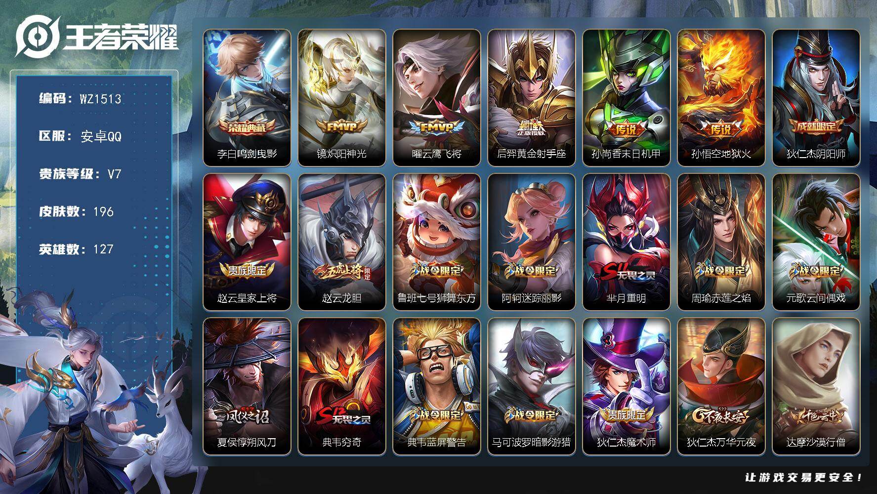 - [13577388]可二次【店主推荐捡漏号!可直接换绑】:安卓Q-V6-尊贵铂金I段位-114英雄-163皮肤-1星元-5传说-44史诗 【传说皮肤】:李信山海炽霜斩,孙悟空零号赤焰,曜云鹰飞将,干将莫邪久胜战神,李白凤求凰 【限定皮肤】:白起狰,狄仁杰阴阳师,虞姬凯尔特女王,赵云皇家上将,嬴政优雅恋人,嬴政白昼王子,鲁班七号狮舞东方,阿轲迷踪丽影,钟无艳王者之锤,孙膑妖精王,扁鹊炼金王,芈月重明,吕布猎兽之王,周瑜赤莲之焰,元歌云间偶戏,夏侯惇朔风刀,曹操烛龙,典韦穷奇,马可波罗暗影游猎,马可波罗山海玄木吟,狄仁杰魔术师,狄仁杰万华元夜,达摩沙漠行僧,项羽海滩派对,老夫子醍醐杖,程咬金演武夺筹,刘邦夺宝奇兵,兰陵王驯魔猎人,兰陵王金庭之子,亚瑟潮玩骑士王,孙悟空零号赤焰,牛魔御旌,李元芳银河之约,李元芳云中旅人,钟馗神迹守卫,钟馗驱傩正仪,杨玉环遇见飞天,雅典娜单词大作战,雅典娜黎明之约,蔡文姬繁星吟游,太乙真人饕餮,太乙真人华丽摇滚,鬼谷子原初探秘者,鬼谷子五谷丰年,苏烈千军破阵,百里玄策原初追逐者,弈星混沌棋,梦奇顽趣,沈梦溪星空之诺,沈梦溪大漠名商,明世隐疑决卦,裴擒虎李小龙,裴擒虎擒涛扼浪,狂铁御狮,米莱狄御霄,云中君纤云弄巧,李信山海炽霜斩,盾山御銮,猪八戒西部大镖客,上官婉儿梁祝,上官婉儿天狼绘梦者,蒙犽狂想玩偶喵,鲁班大师探海日志,桑启海盐诗旅,张良古海寻踪 【年限皮肤】:李白凤求凰,马可波罗山海玄木吟,李信山海炽霜斩 【赛季限定】:孙膑妖精王,扁鹊炼金王,白起狰,芈月重明,夏侯惇朔风刀,曹操烛龙,典韦穷奇,狄仁杰万华元夜,达摩沙漠行僧,老夫子醍醐杖,程咬金演武夺筹,兰陵王金庭之子,张良古海寻踪,牛魔御旌,李元芳云中旅人,虞姬凯尔特女王,钟馗驱傩正仪,雅典娜黎明之约,太乙真人饕餮,鬼谷子原初探秘者,苏烈千军破阵,百里玄策原初追逐者,弈星混沌棋,梦奇顽趣,沈梦溪大漠名商,明世隐疑决卦,裴擒虎擒涛扼浪,狂铁御狮,米莱狄御霄,盾山御銮,鲁班大师探海日志,桑启海盐诗旅 【战令限定】:嬴政白昼王子,鲁班七号狮舞东方,阿轲迷踪丽影,吕布猎兽之王,周瑜赤莲之焰,元歌云间偶戏,马可波罗暗影游猎,刘邦夺宝奇兵,兰陵王驯魔猎人,亚瑟潮玩骑士王,李元芳银河之约,钟馗神迹守卫,雅典娜单词大作战,沈梦溪星空之诺,猪八戒西部大镖客,蒙犽狂想玩偶喵 【史诗皮肤】:露娜紫霞仙子,钟无艳王者之锤,赵云