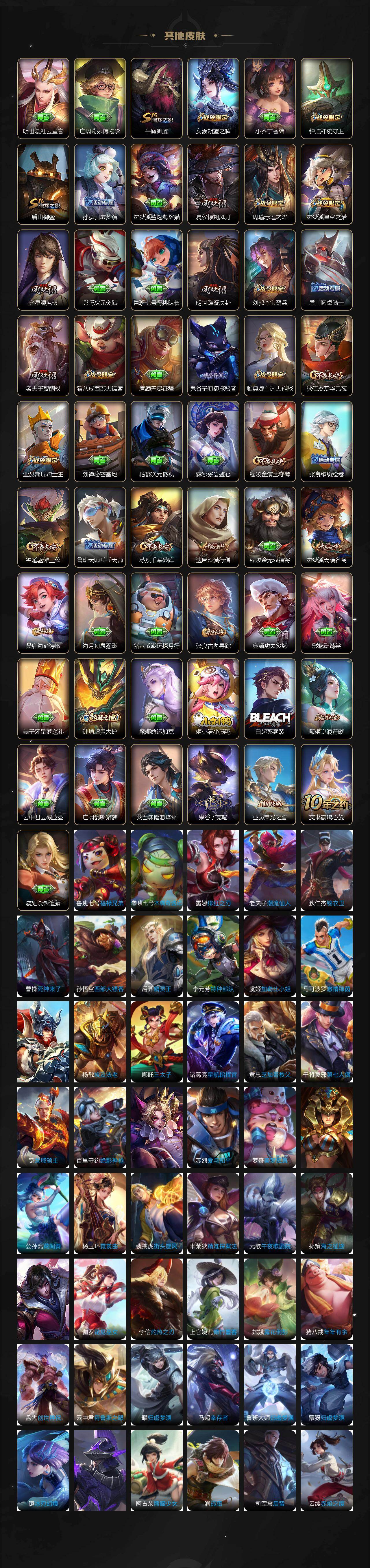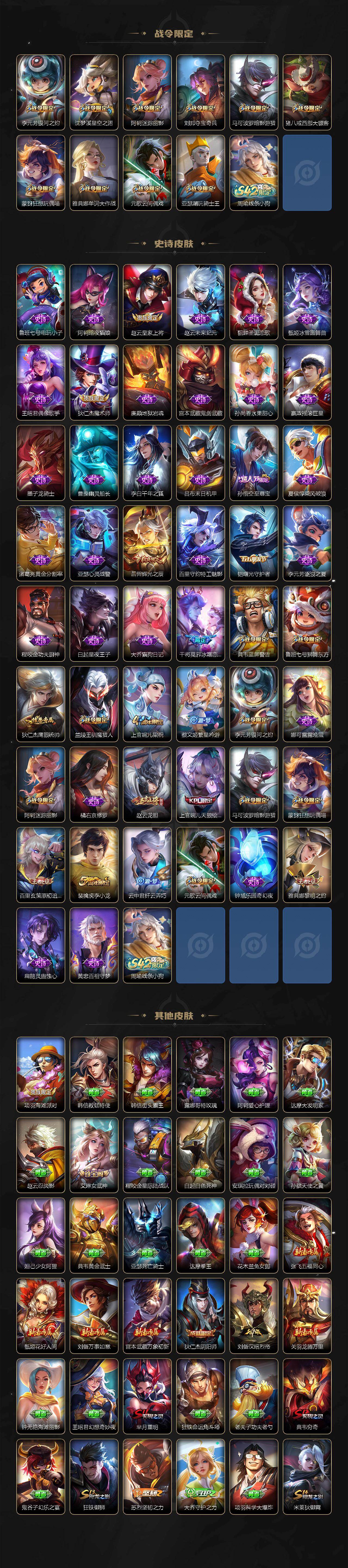 【限定皮肤】:狄仁杰阴阳师,赵云皇家上将,赵云龙胆,鲁班七号狮舞东方,阿轲迷踪丽影,芈月重明,周瑜赤莲之焰,元歌云间偶戏,夏侯惇朔风刀,典韦穷奇,典韦蓝屏警告,马可波罗暗影游猎,狄仁杰魔术师,狄仁杰万华元夜,达摩沙漠行僧,项羽海滩派对,老夫子醍醐杖,程咬金演武夺筹,刘邦夺宝奇兵,兰陵王驯魔猎人,亚瑟潮玩骑士王,孙悟空至尊宝,牛魔御旌,后羿辉光之辰,李元芳银河之约,钟馗神迹守卫,钟馗驱傩正仪,女娲朔望之晖,干将莫邪冰霜恋舞曲,雅典娜单词大作战,雅典娜黎明之约,蔡文姬繁星吟游,鬼谷子原初探秘者,苏烈千军破阵,百里玄策原初追逐者,弈星混沌棋,沈梦溪星空之诺,沈梦溪大漠名商,明世隐疑决卦,裴擒虎李小龙,狂铁御狮,米莱狄御霄,云中君纤云弄巧,盾山御銮,猪八戒西部大镖客,上官婉儿梁祝,上官婉儿天狼绘梦者,蒙犽狂想玩偶喵,桑启海盐诗旅,艾琳女武神,张良古海寻踪