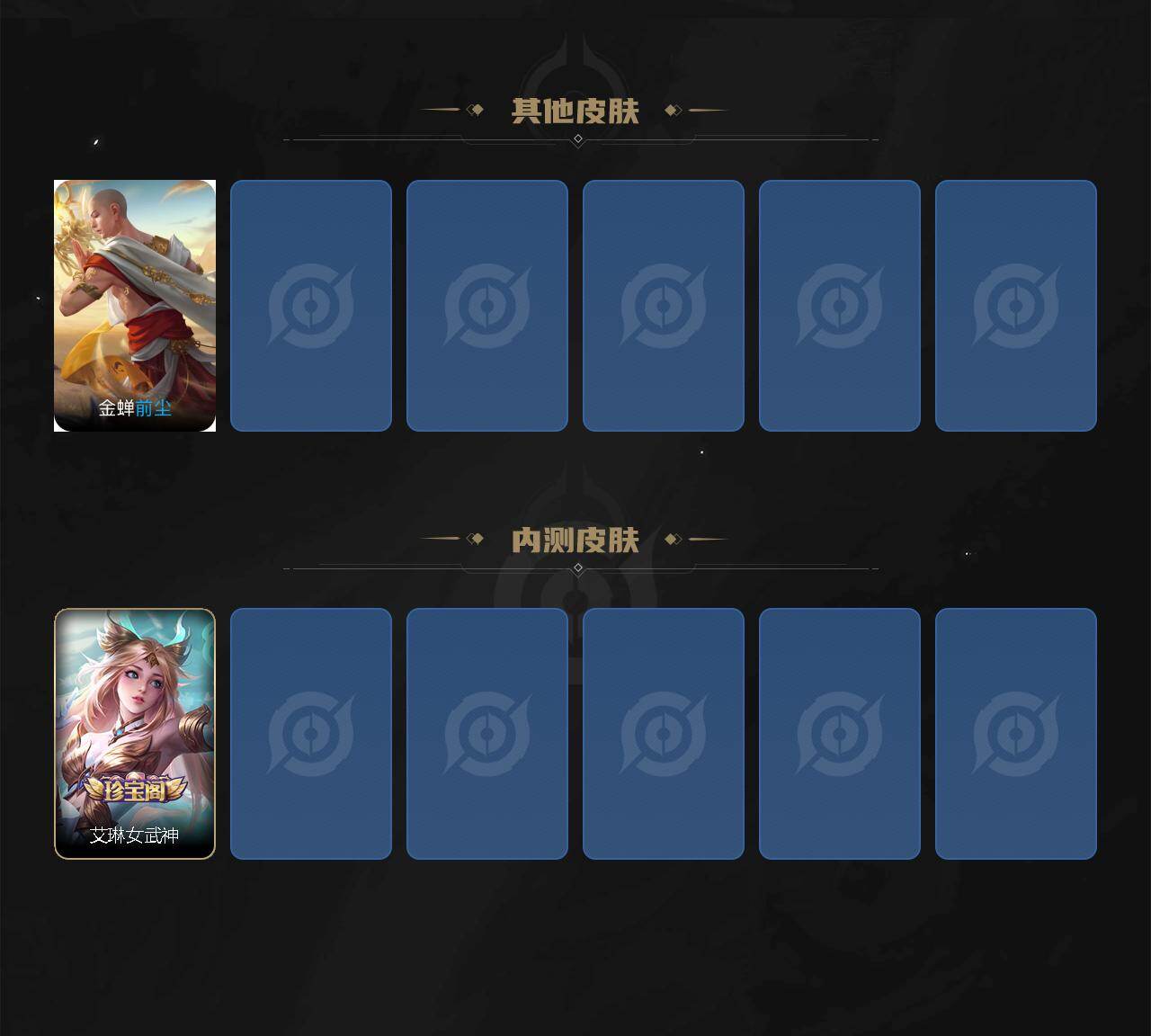 【战令限定】:典韦蓝屏警告,女娲朔望之晖,鲁班七号狮舞东方,钟馗神迹守卫,兰陵王驯魔猎人,周瑜赤莲之焰,李元芳银河之约,沈梦溪星空之诺,阿轲迷踪丽影,刘邦夺宝奇兵,马可波罗暗影游猎,猪八戒西部大镖客,蒙犽狂想玩偶喵,雅典娜单词大作战,元歌云间偶戏,亚瑟潮玩骑士王,周瑜线条小狗