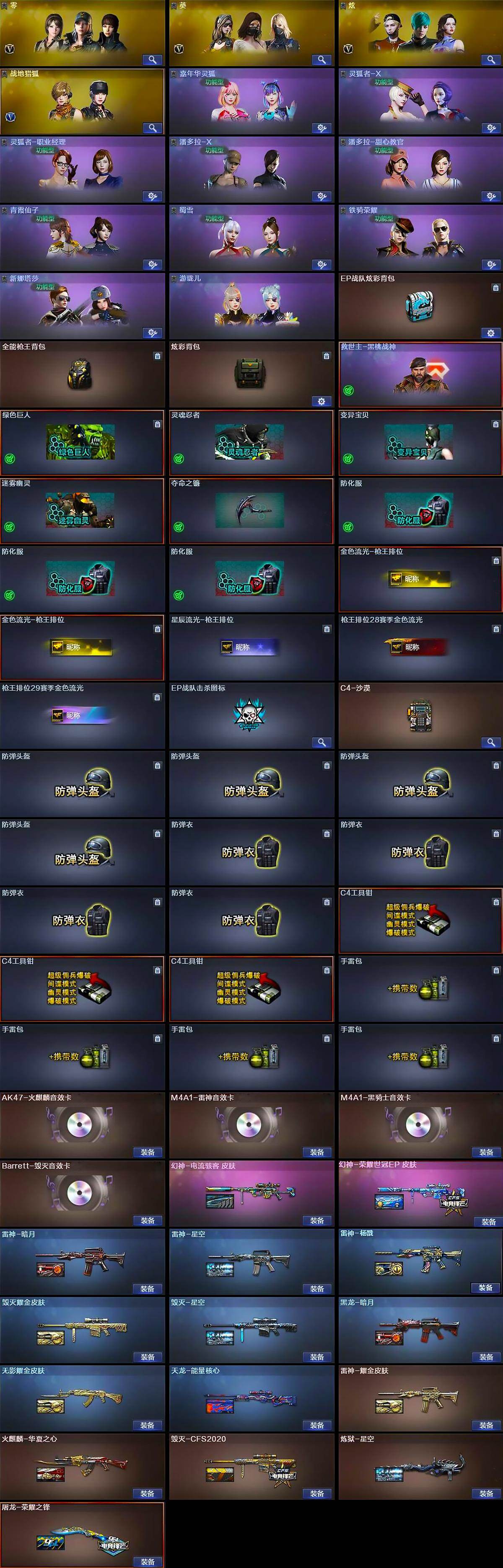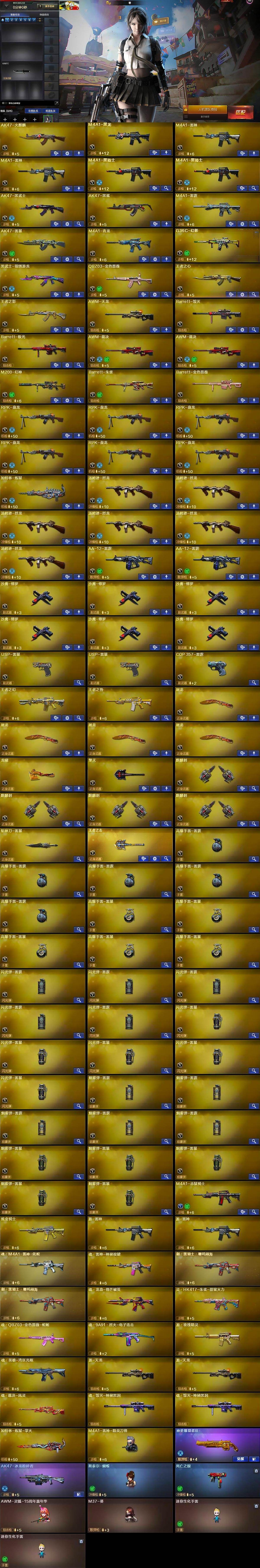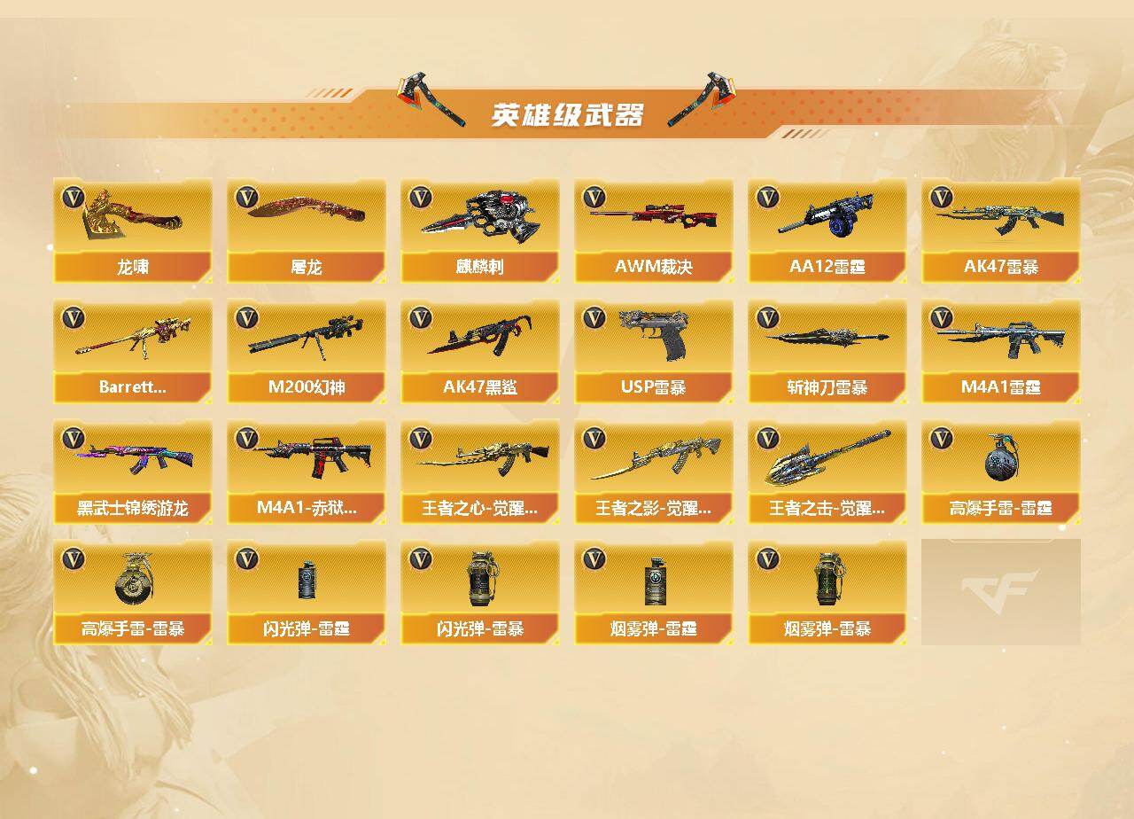 【英雄级武器】:AK47-火麒麟,M4A1-黑龙,M4A1-雷神*2,M4A1-黑骑士*2,AK47-黑武士,AK47-黑鲨,M4A1-雷霆,AK47-雷暴,M4A1-青龙,G36C-幻影,黑武士-锦绣游龙,QBZ03-金色蔷薇,王者之心-觉醒版,王者之影-觉醒版,AWM-天龙,Barrett-毁灭,Barrett-极光,AWM-裁决*2,M200-幻神,Barrett-朱雀,Barrett-金色蔷薇,RPK-盘龙*6,加特林-炼狱,汤姆逊-烈龙*6,AA-12-雷霆*2,沙鹰-修罗*6,USP-雷暴*2,COP-雷霆,屠龙*4,龙啸,擎天,麒麟刺*4,斩神刀-雷暴,王者之击-觉醒版,高爆手雷-雷霆*5,高爆手雷-雷暴*5,闪光弹-雷霆*5,闪光弹-雷暴*5,烟雾弹-雷霆*5,烟雾弹-雷暴*5,M4A1-赤狱骑士
